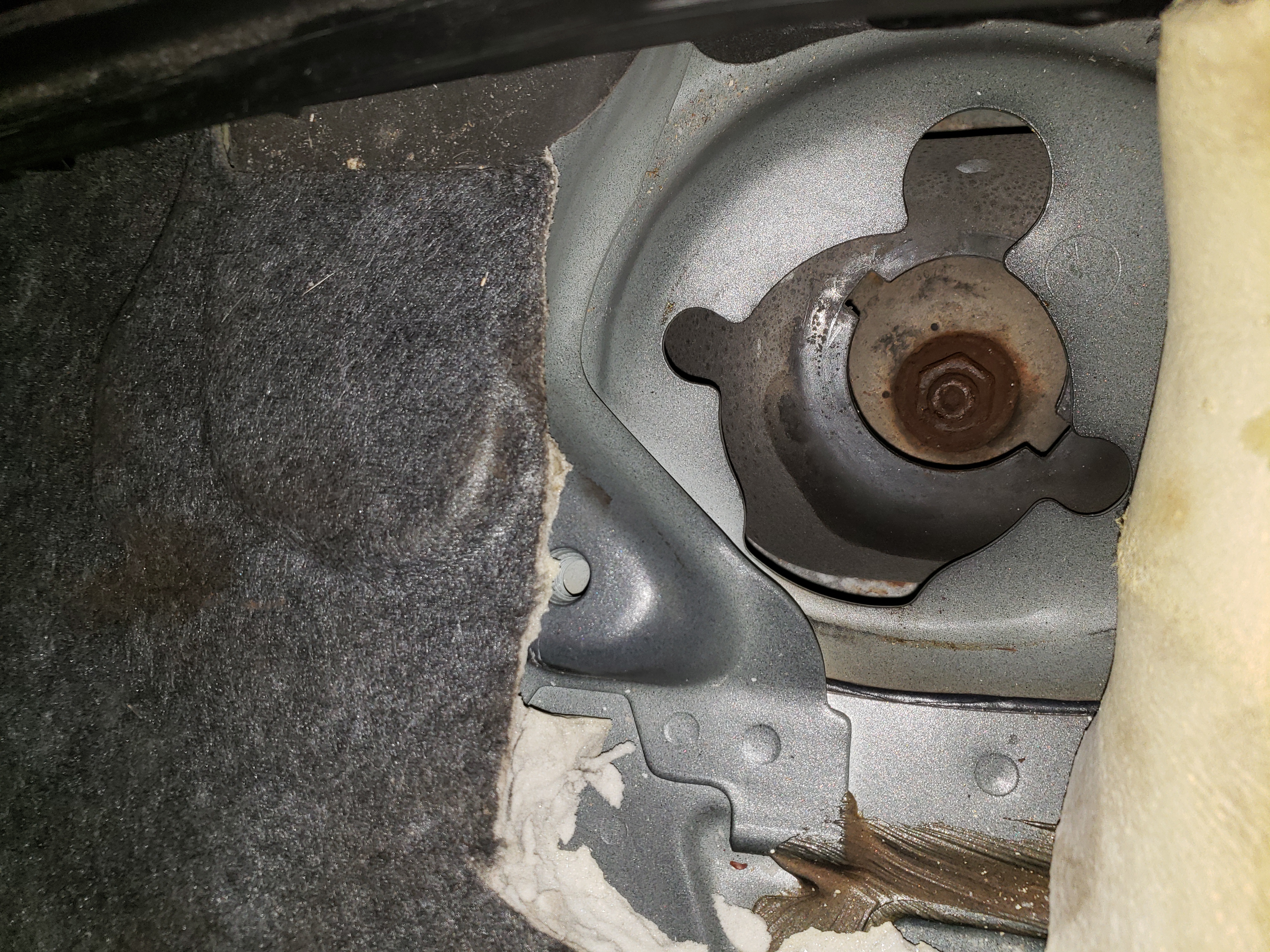 Doing my rear struts on the XC90. It is a 2011 V8. I am completely stuck. I could not get the nut to come lose on top inside the vehicle. I did get it to turn but the whole assembly turns I dont have a deep enough pass thru socket to be able to get a star key up top to try to hold the piston and break the nut free. I also dont have a tool to cut off the nut that is small enough to get I to the access hole. Any ideas on what to use? If it has to be cut is that a bad idea since passenger side seems to be near fuel tank door... I am new to the rear strut removal but there has to be a simpler way to get this out. The bottom bolts come out fine just the top ones have an issue. Please help. See attached pic. Thx