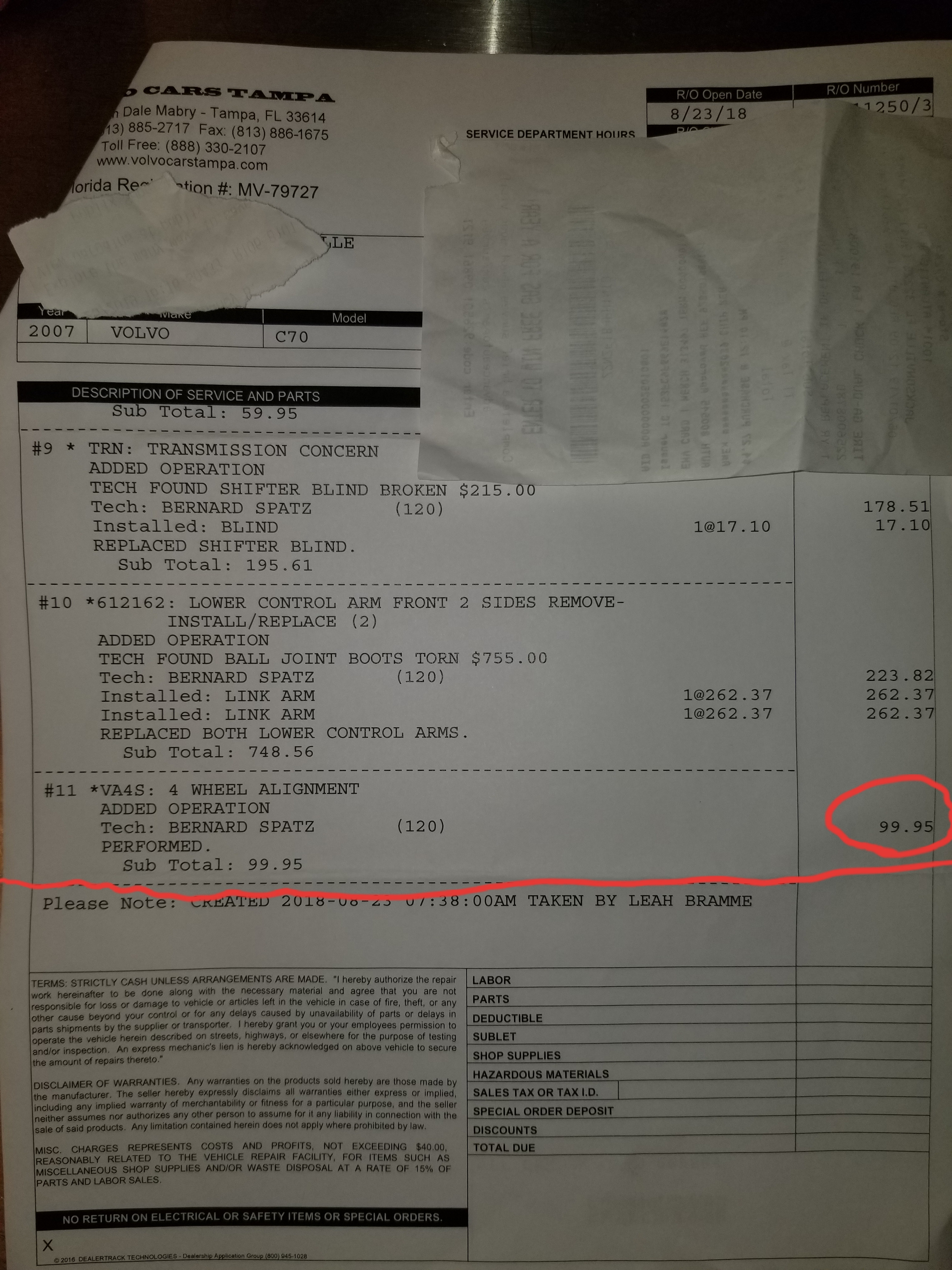 Both Osteen Volvo and Volvo of Tampa charge less than $100 for a 4 wheel alignment. That seems on par with the tire stores from my experience. I am curious who you ended up using and the price. June