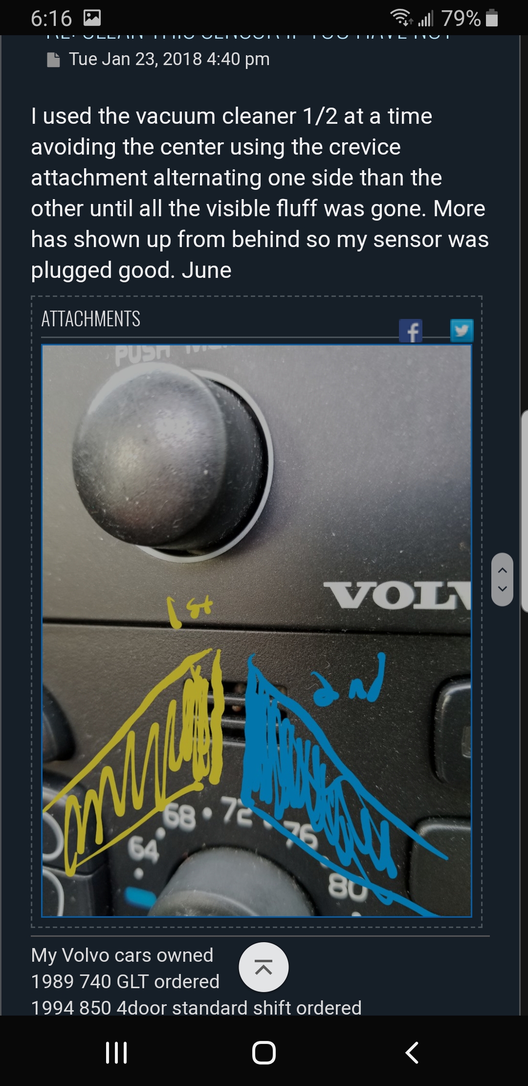 I have a 2006 s60 2.5t awd Volvo with 200k. Everything works or DID. I looked into the little climate control sensor window and saw what looked like a dust bunny so I took a small hooked wire and pulled it out through the opening thinking I was doing good(should have left it alone)