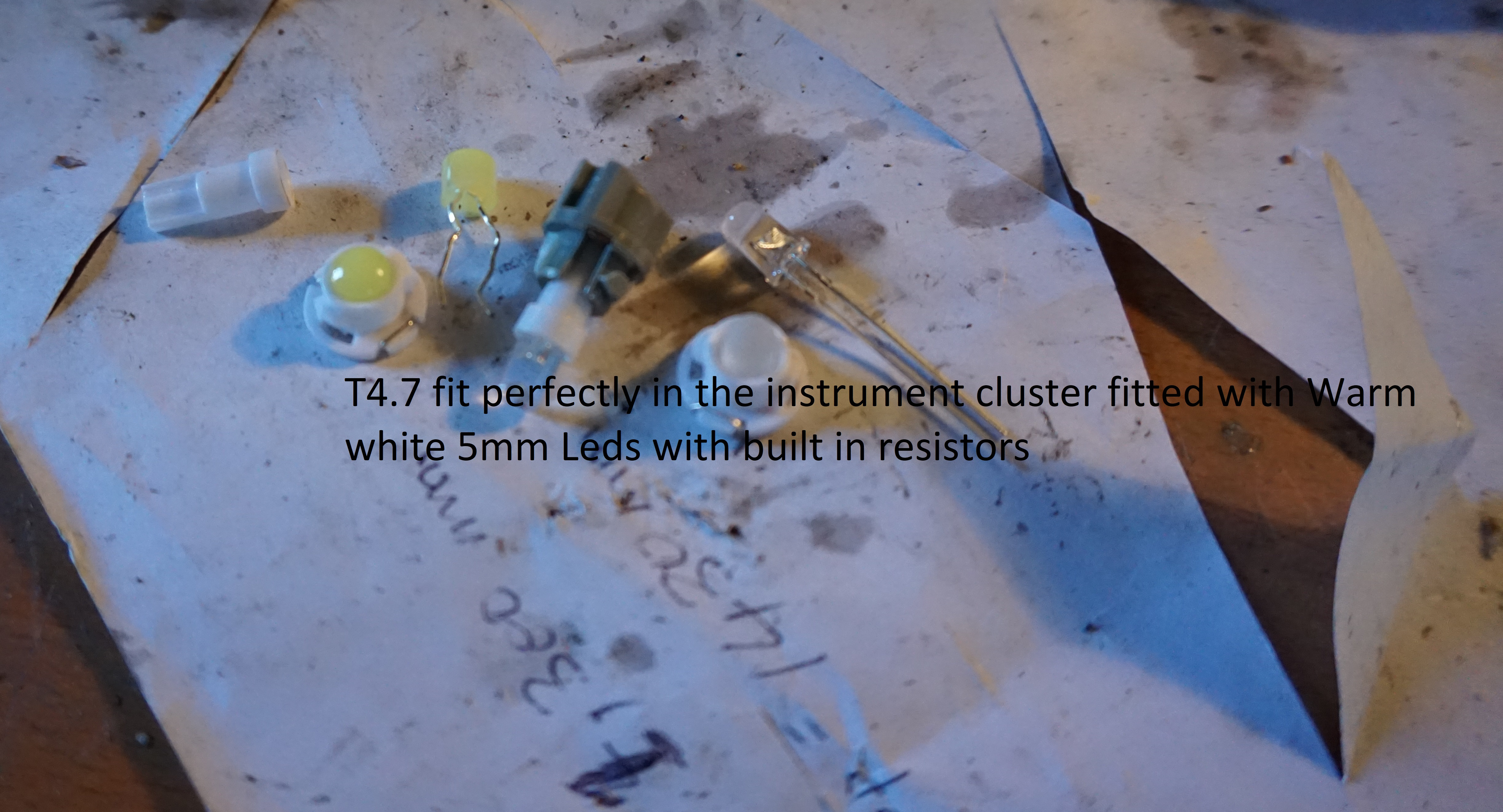 Has anyone tried LED dash and instrument cluster lights?..i purchased some T5 pure white and green LED bulbs, first off the white bulbs yurn the cluster a weird green colour (see pic), secondly they created bright and dark spots (uneven lighting) which looked terrible. The solution was to order Warm white 5mm leds (built in resistor) and take apart the T5 LED and fit the 5mm LED, i also sanded (diffused) using light sand paper, the result is very very close to factory. These lights are "always on" with the ignition key, they are not switched to the headlights as i wrongly assumed.