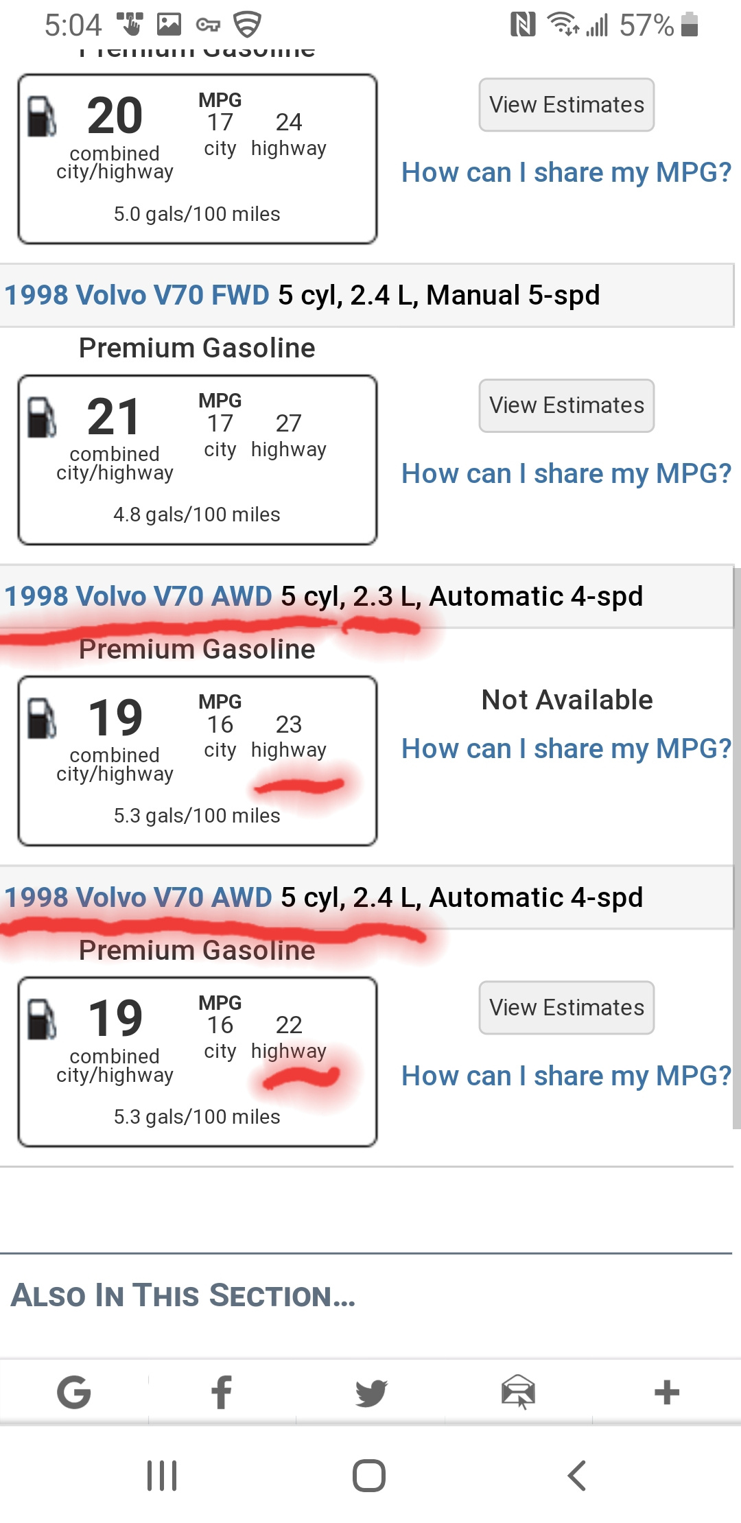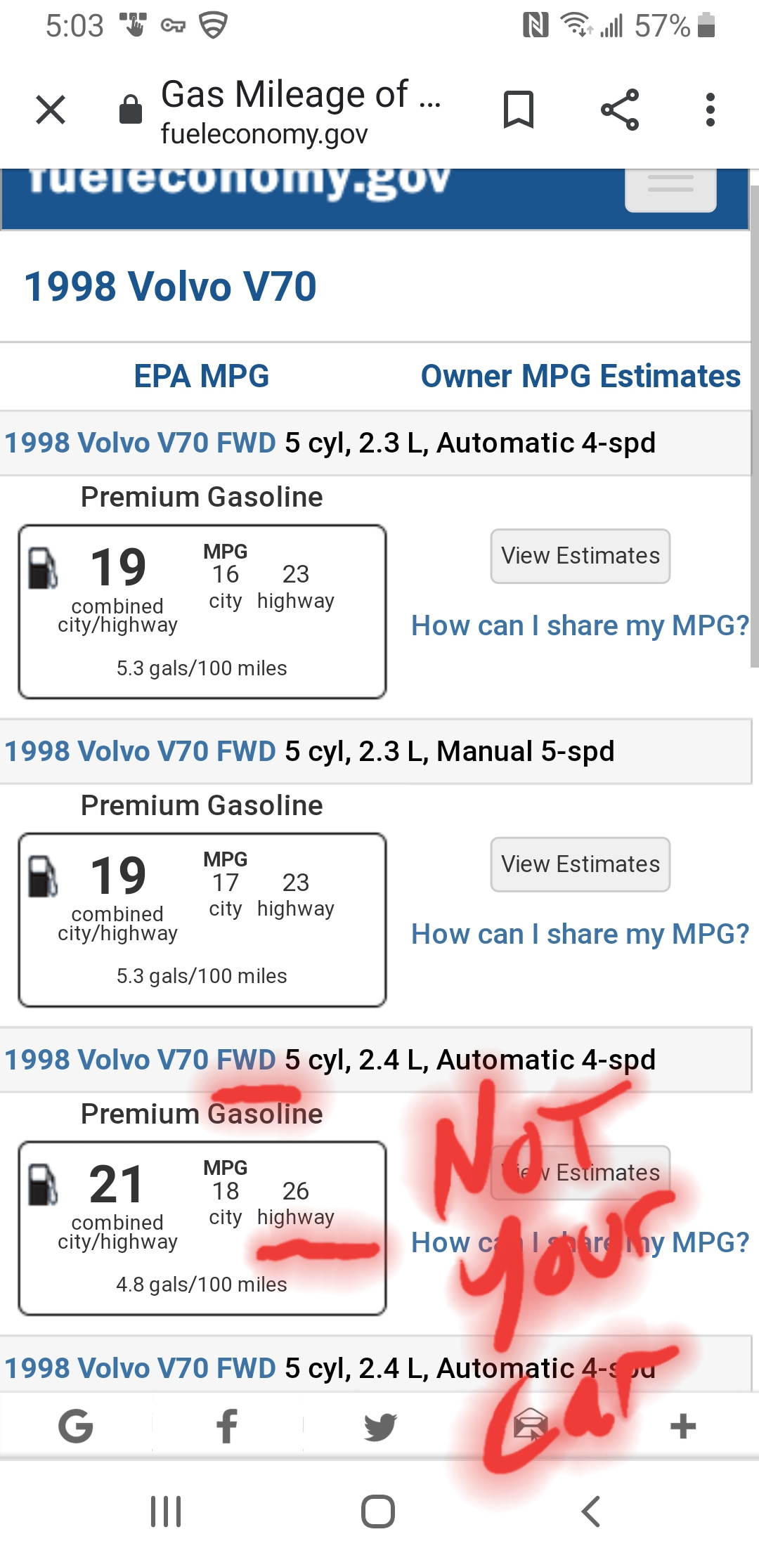 Your car is not rated 17/26 mpg that is for a front wheel drive 2.4L equipped car. Here are some screenshots of the EPA gas mileage for the 2.4 FWD which is not your car and the 2.3 and 2.4 AWD of which one is your car. I owned a new 98 V70 XC 2.3L and it was no gas miser. That was never the point of the car. Also notice Premium fuel is stipulated as used by the EPA during testing. If you use regular and run heavy oil that alone will make the couple mpg difference from what you are getting and what the actual original mpg rating is. June