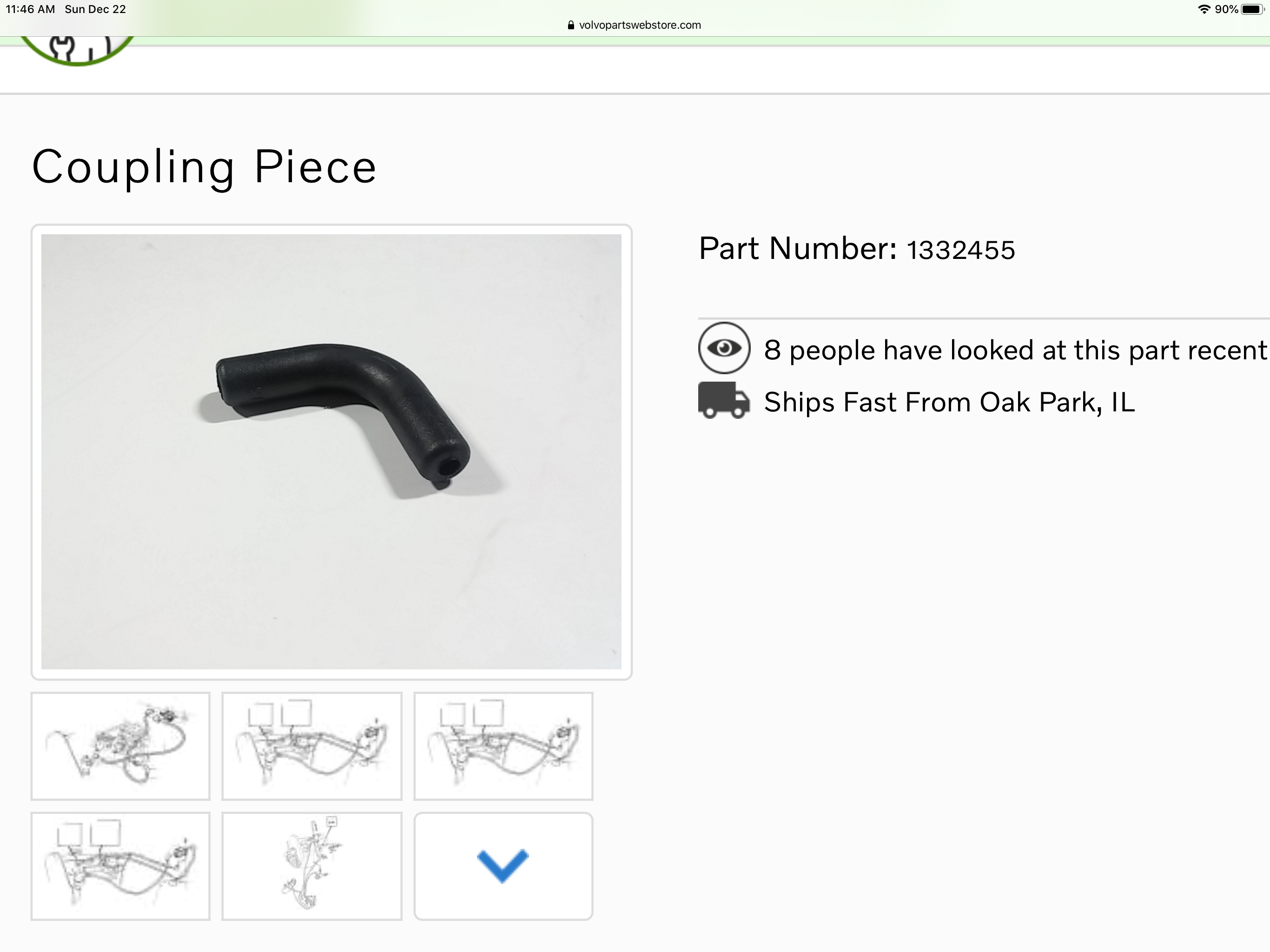 The air motor hard pipe connectors, small L shaped rubber grommets are available from Volvo 1332455 or FCP and are different sizes on each end. You can see my solution , using a cheap one from a FLAPS and a zip tie to tighten the end on the hard line