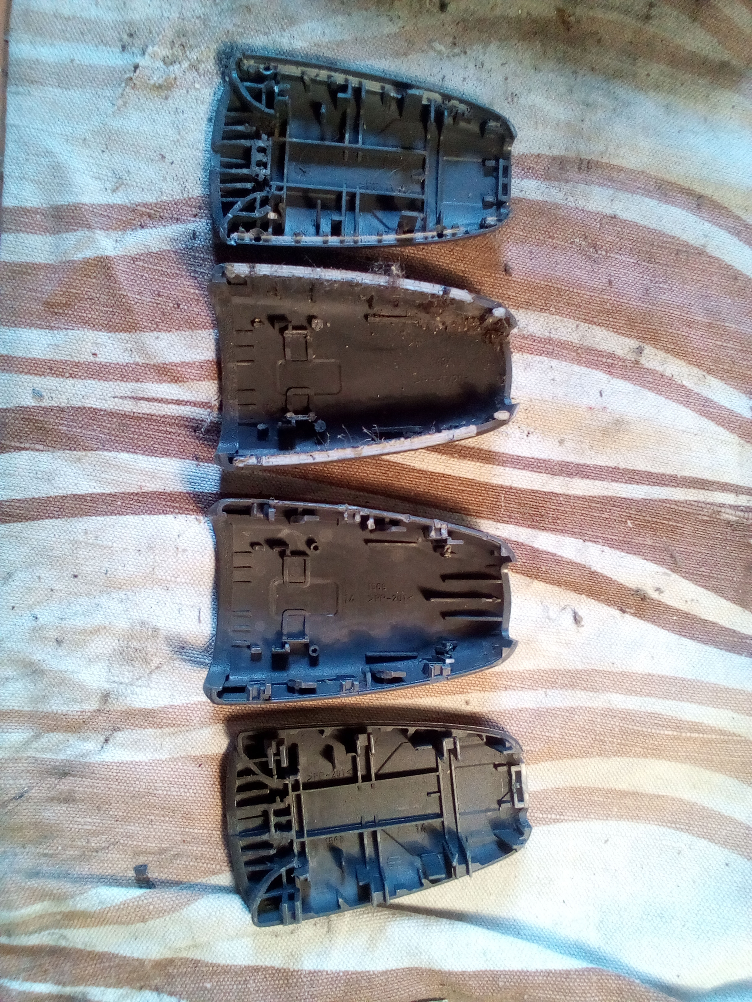 The front seatbelt casing slides apart where the rear casings are glued. the casings are interchangable, probably glued to prevent kids opening them?.