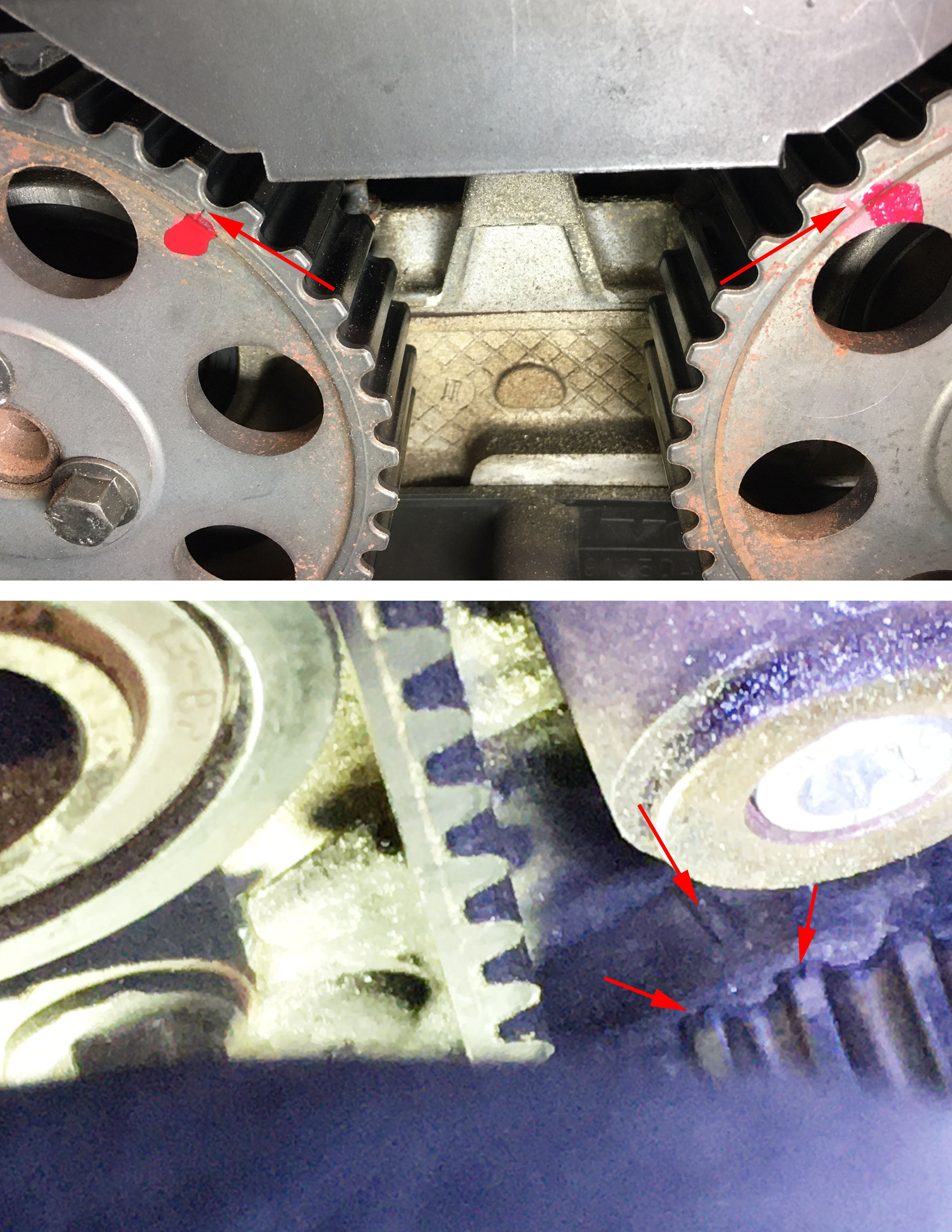 Researching my issue the past few days, reading a lot about ANY timing belt slip means your engine is toast? I'm hoping Rick is correct though! I do see what I would consider significant play (1/2"-3/4") in the belt when its pressed as seen in the attached image. The hydraulic tensioner (cylinder/plunger) also moves quite easy when force is applied. I know form experience how difficult it is to compress the tensioner cylinder/plunger with a clamp.