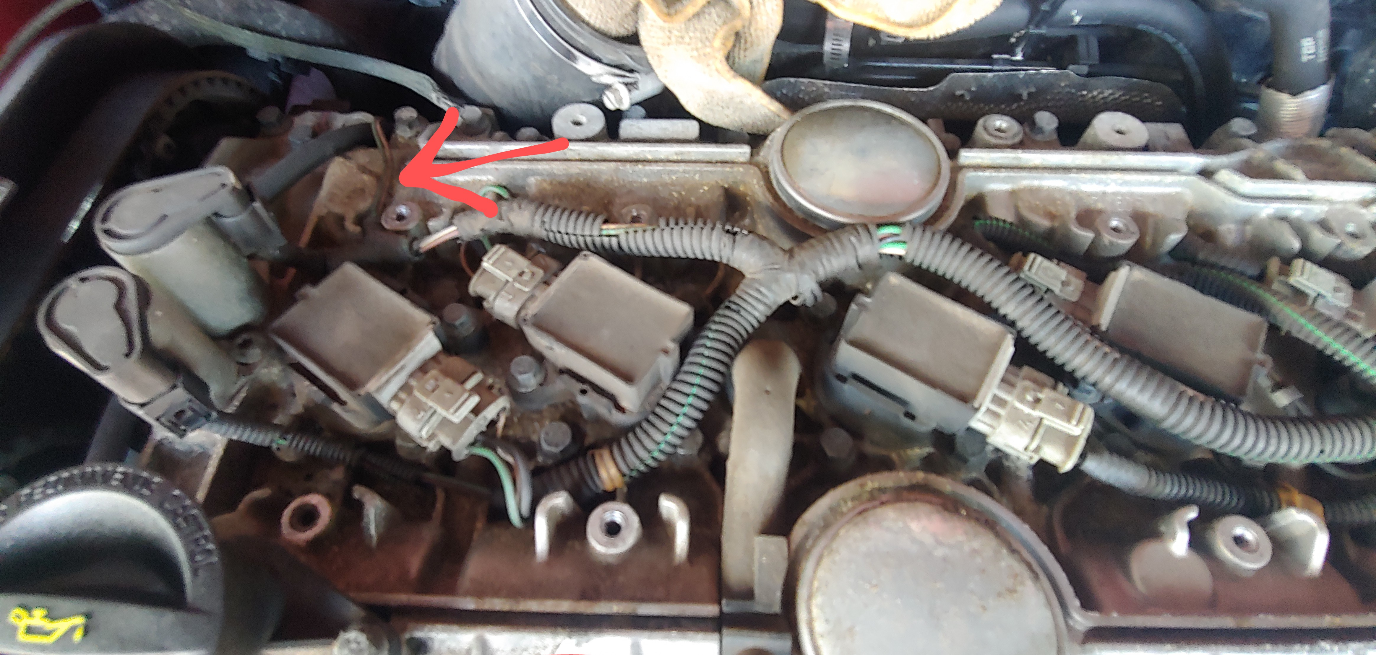 The arrows pointing at the wire I've got it wrapped now in a little bit of electrical tape. I believe it's right by the back side camshaft connector going down towards the turbo?