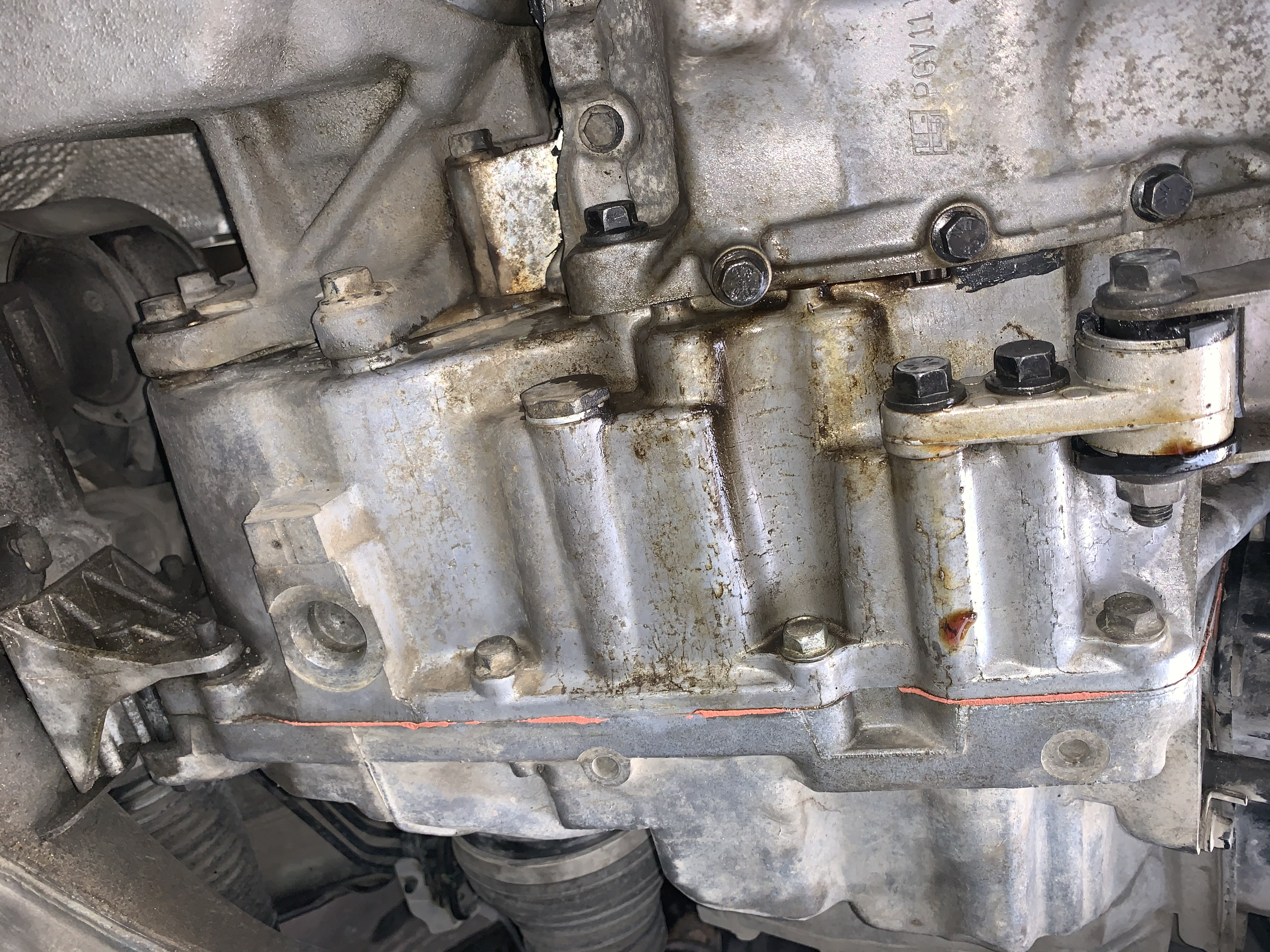 I’m thinking it’s either the rear seal or possibly the oil pan, it’s been dealer maintained it’s whole life, it seems the pan has been off already and someone was horny with the RTV liquid gasket lol - see pic.