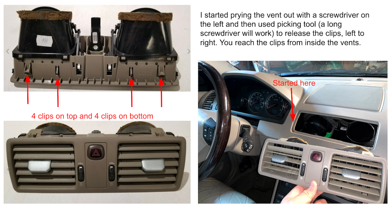 Once you understand how this is mounted, it's not too hard. Start on the left and pry with steady pressure, but then use a thin screwdriver or other tool to reach inside the vent and release the clips. I did this from the left, so you'll release the upper and lower leftmost clips first and then work your way right. When the vent comes out, be sure and unplug the hazard switch .