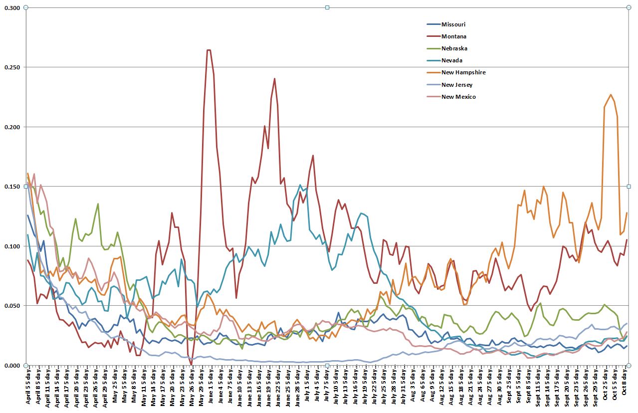 The fifth graph is Missouri to New Mexico. Montana and New Hampshire are states with the highest growth rate in this group. Nebraska has moderate growth rate, but recently has dropped. The other states have generally low growth rates, but have been climbing in recent weeks.