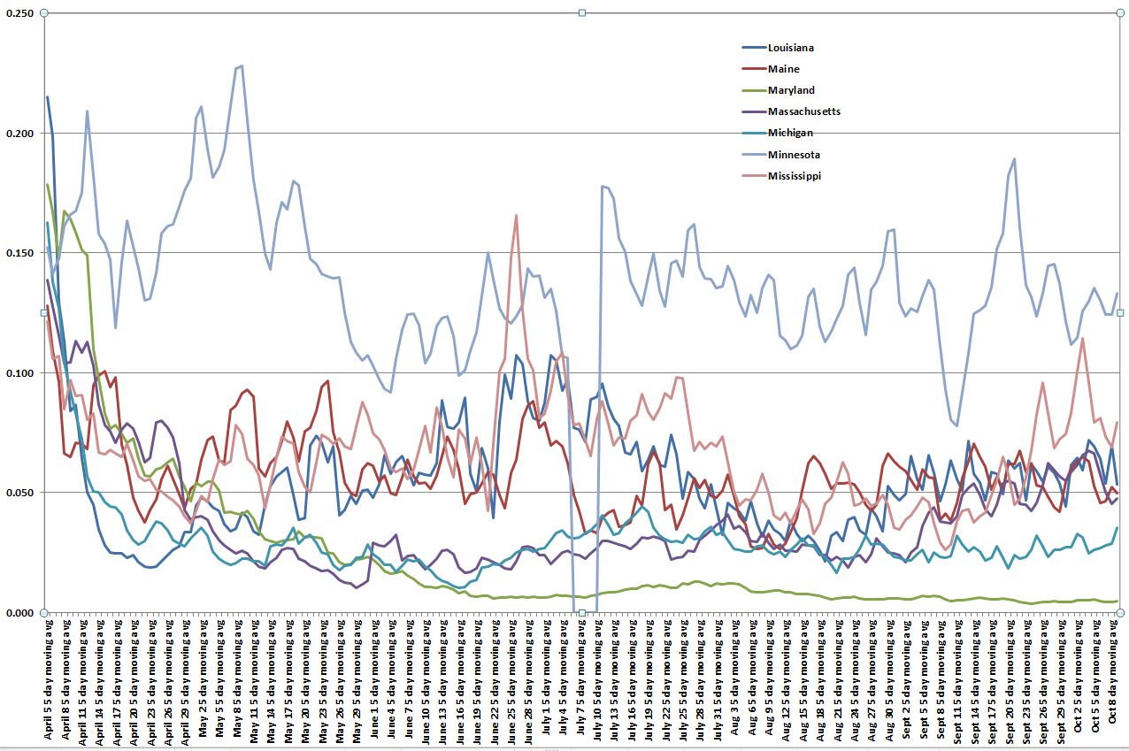 I have created eight new graphs with about 6 or 7 states in each showing growth rate from April 5 to Oct 9. There are some interesting changes from two months ago. This data used 5 day moving averages to smooth some of the noise. These graphs are a bit busy with all the lines together. Note that the vertical scale changes for each graph. I will give some commentary for each.
