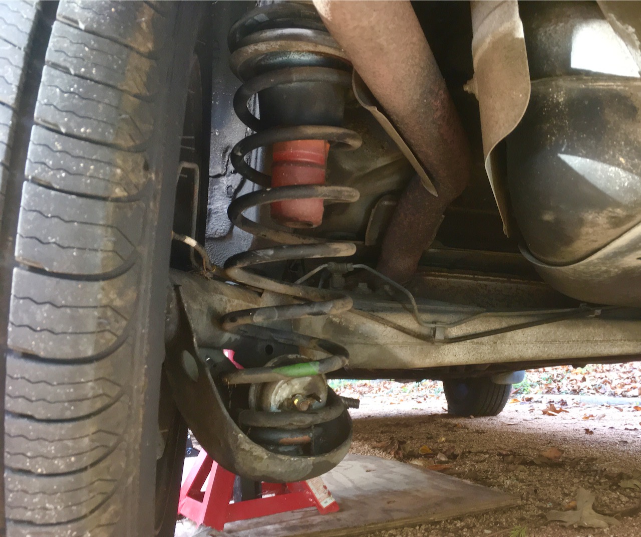 Next I jacked up the side of the car to lift the weight of the car off of the spring and placed a jackstand under the rear suspension: