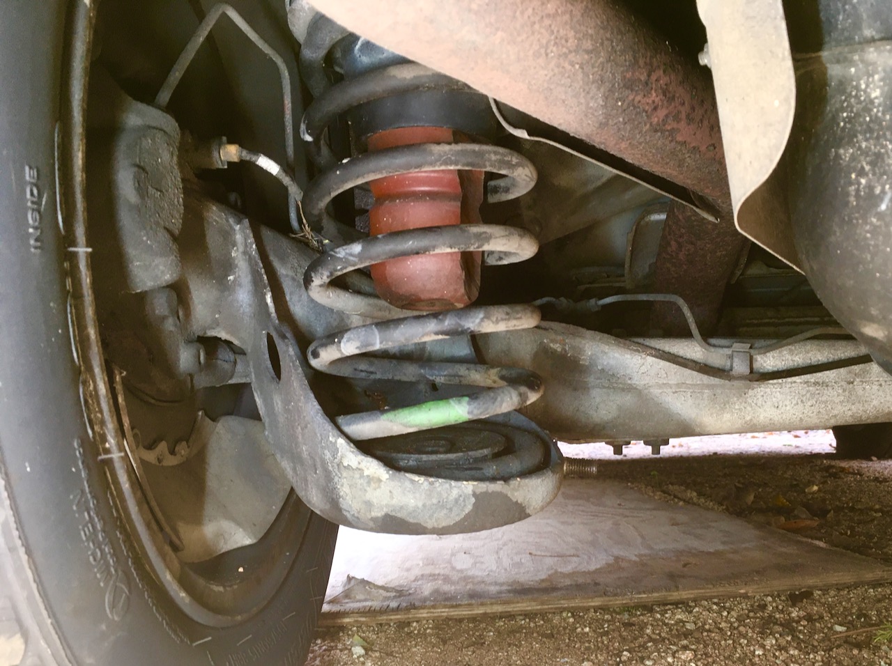 Once you have the side of the car lifted and safely supported, you can go back underneath to remove the spring. If you've jacked the car high enough, you'll see the spring is extended and ready to be removed: