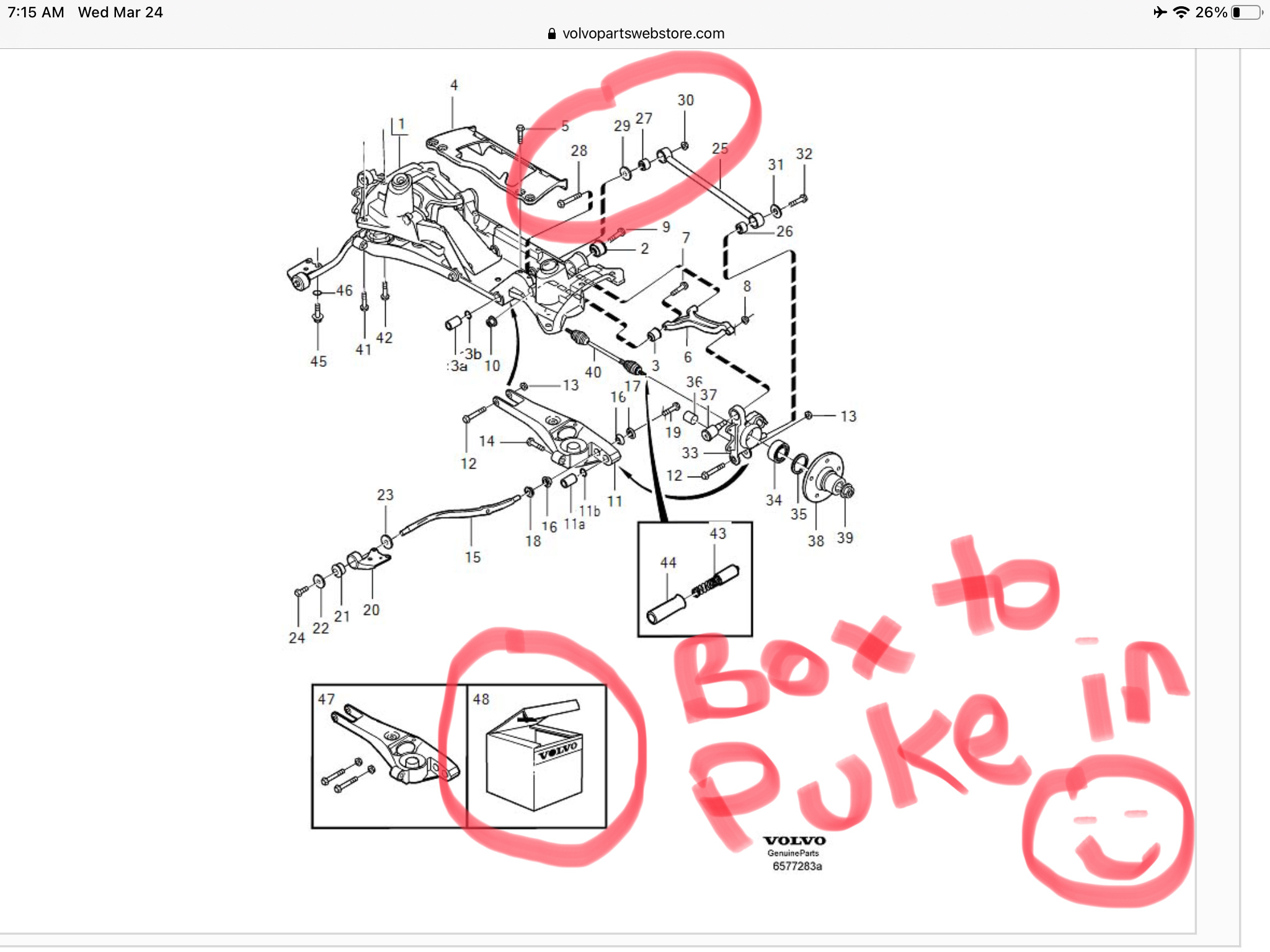 New issue, I have an eccentric bolt and a funny slotted washer on the inboard stay bushing, 27. Can’t find that in the web store. It’s nice volvo also sells a box you can throw up into when you pull up this diagram