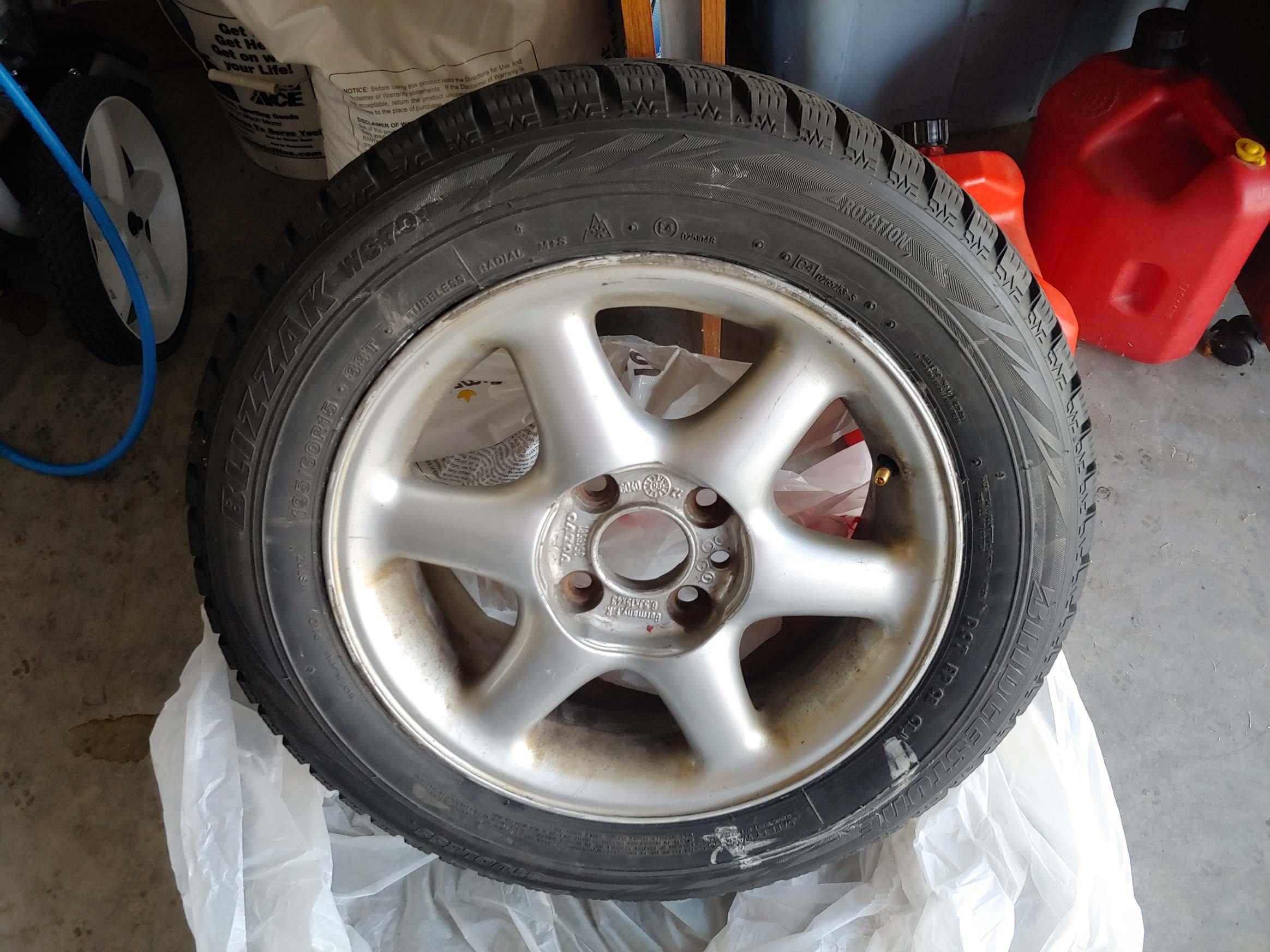 4 Bridgestone Blizzak tires, size 195/65-R15, mounted and balanced on stock, 4 bolt, Volvo alloy wheels.