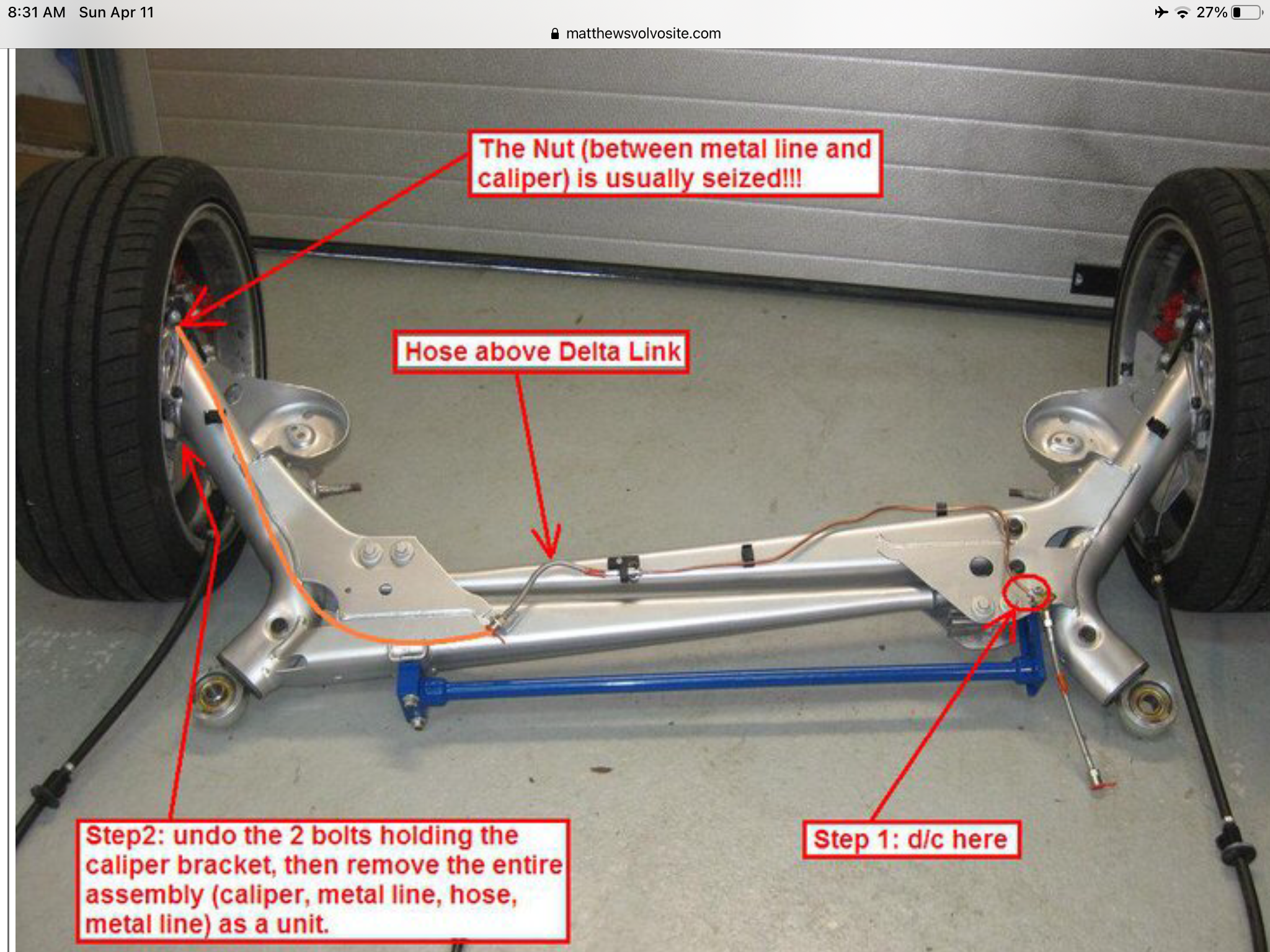 Last fall when I dismantled the rear brakes on my parts car while it was in the driveway, I did not have much trouble with the brake hose above the delta link so I was able to just remove it all piece by piece, from caliper to metal lines to hose (I threw out the hose, kept the lines and calipers). I think it took about an hour and a half to remove everything, including the rear hubs.