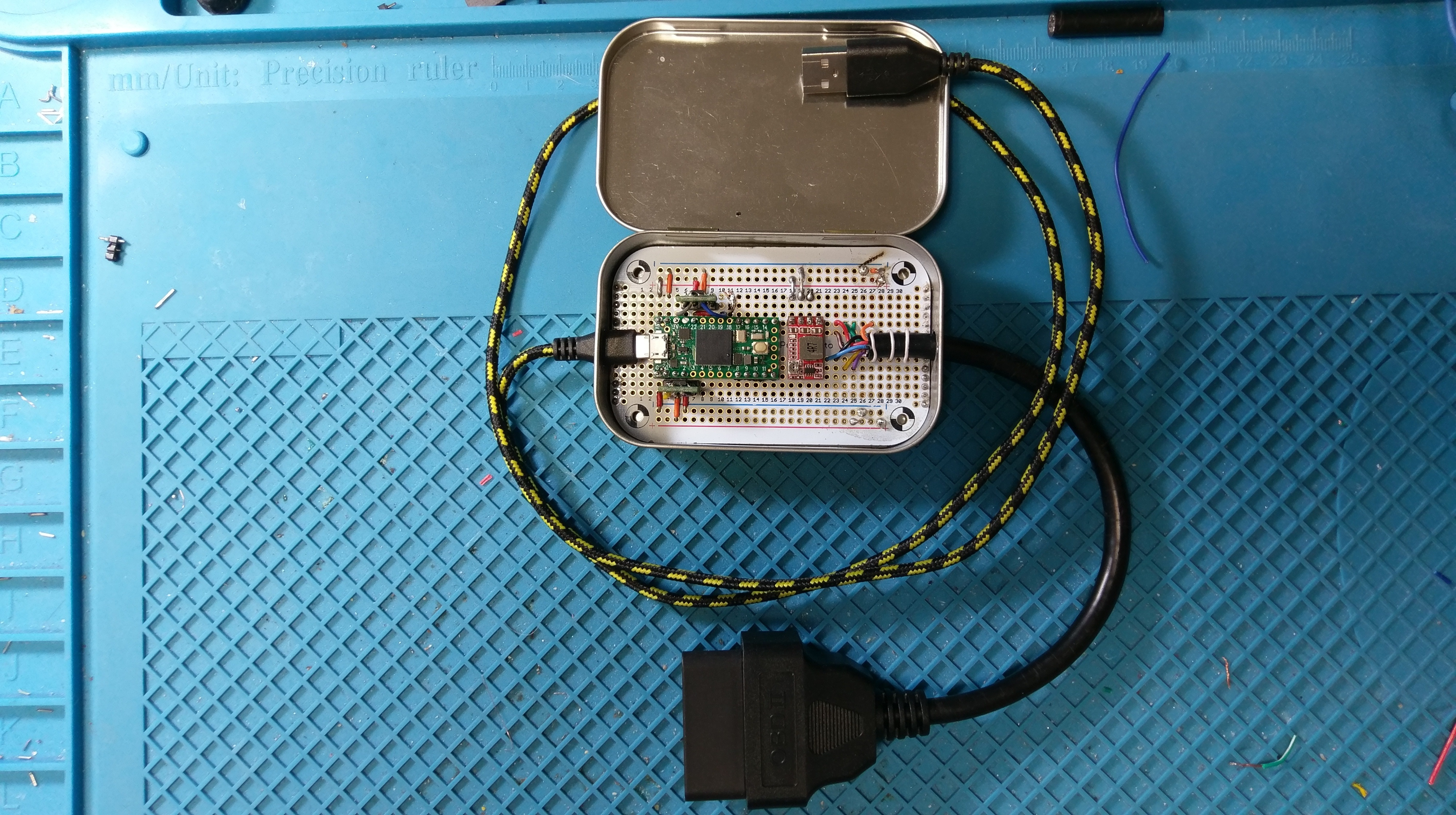 You have a Red wire running from the Teensy V-IN to J1 V-USB. That is the same as not cutting the trace. You also have Teensy grounded to the USB port. Remove the Red and Black wires fron J1. Plug the interface into the OBD2 port. The Tennsy will power off U4.