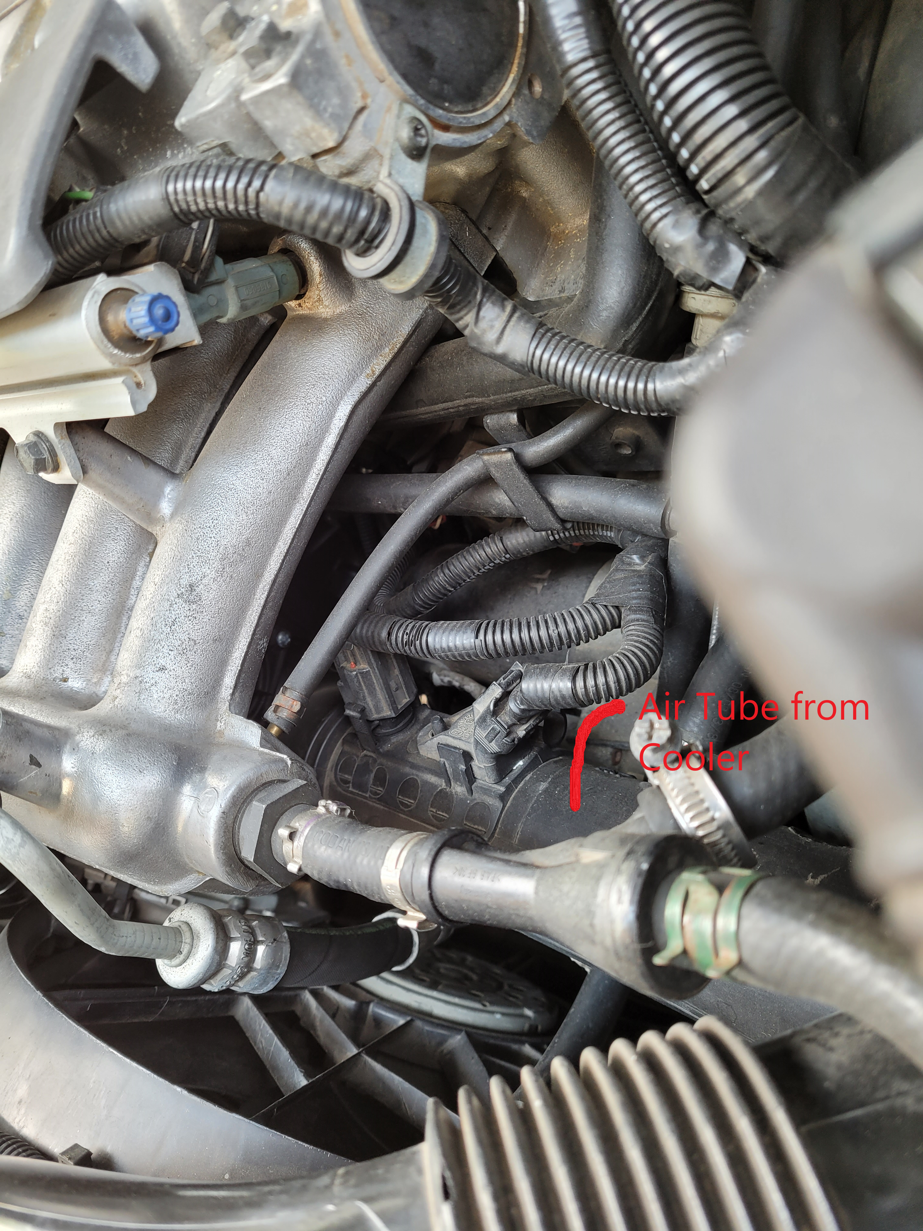 The throttle body (Electronic Throttle Module - ETM) is to the left of the air tube from cooler in the last photo. It is directly under the center of the intake manifold and double fist sized.