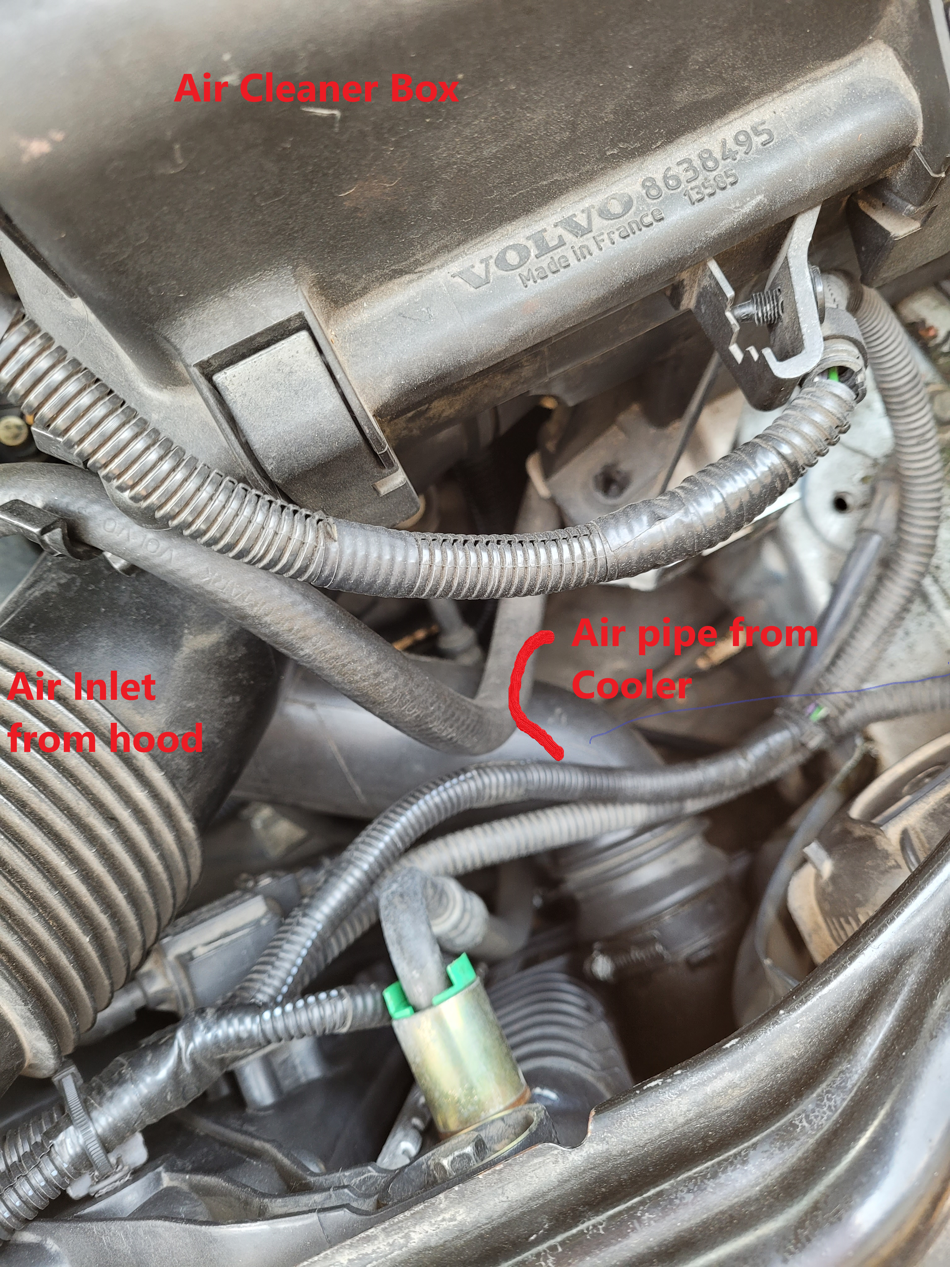 I took some photos of my 2001 V70 T5 engine in the same area and added some labels. It appears you are missing the Turbo Control Valve at least. The Turbo Control Valve has two wires going to it. One is green and the other is gray(?). They may have another color stripe.