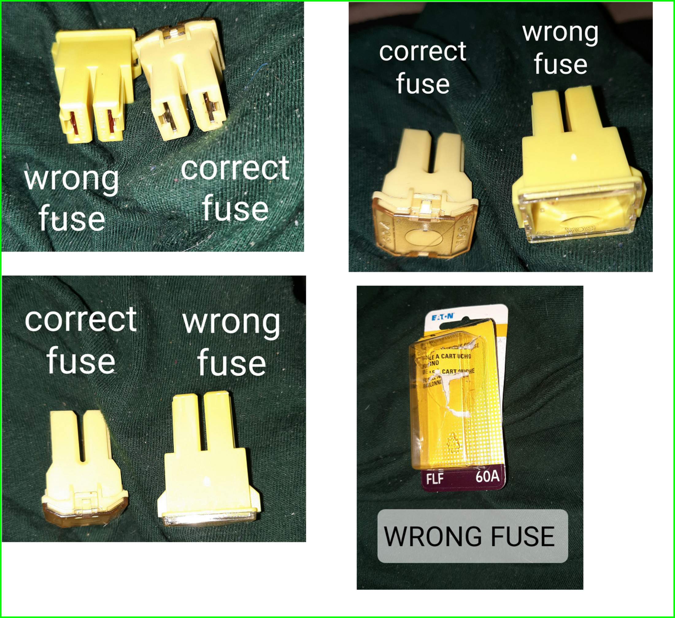 Maybe another question is, is there a generic part number like from Little Fuse or something that matches the original fuse exactly? That would be nice. Otherwise, maybe a recommendation where to buy one of the original part number. A generic part number would be such as the bottom right pic where there is a number like FLF or FLG or some other letters or numbers or whatever followed by a current rating which here would have to be 60 amps, and it would have the brand name of a major fuse manufacturer.