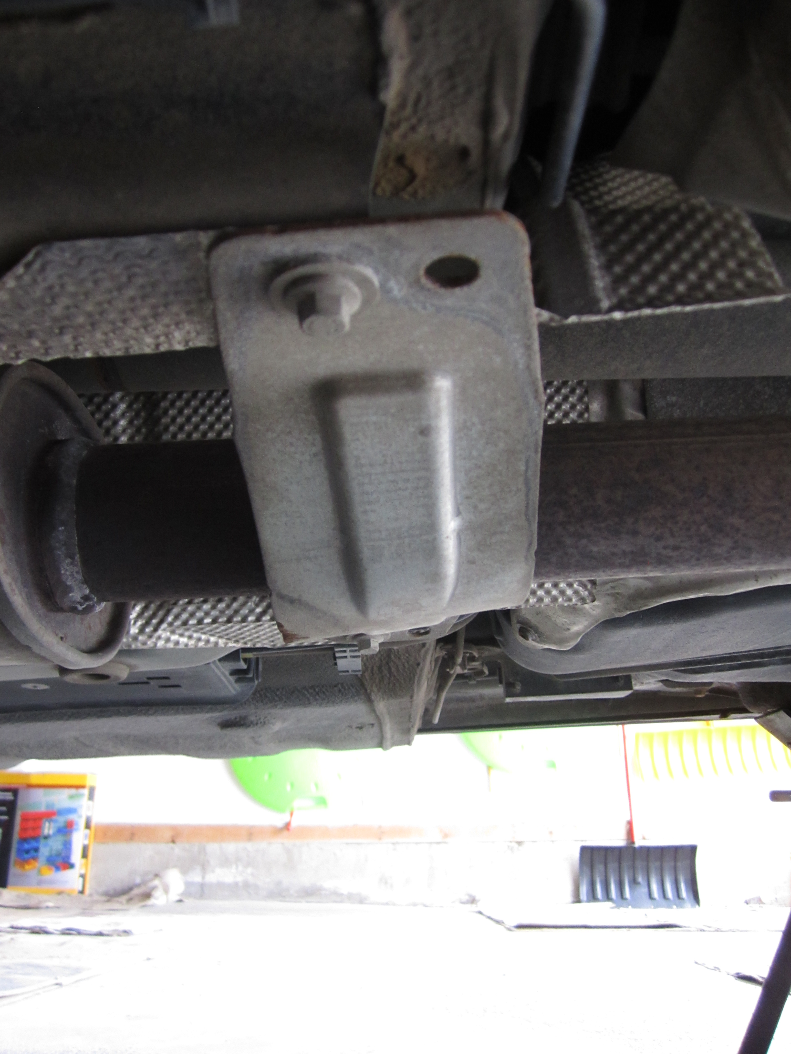 Rear muffler box mount looking up from underneath rear of car