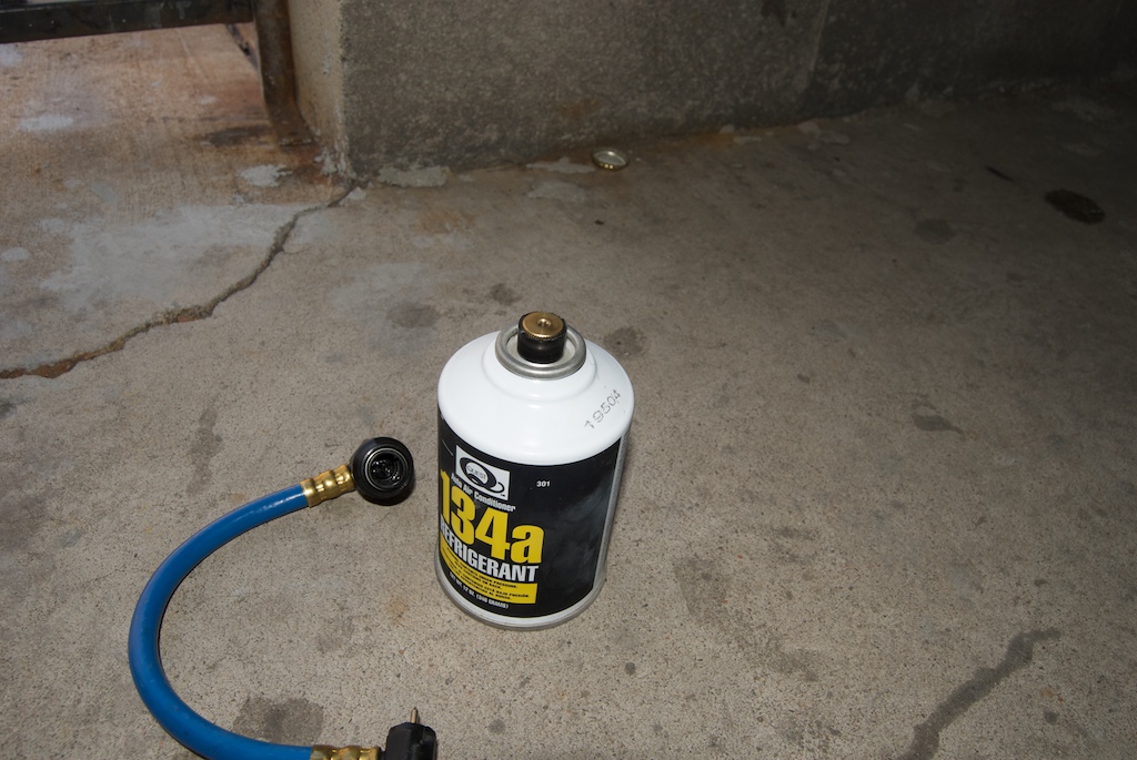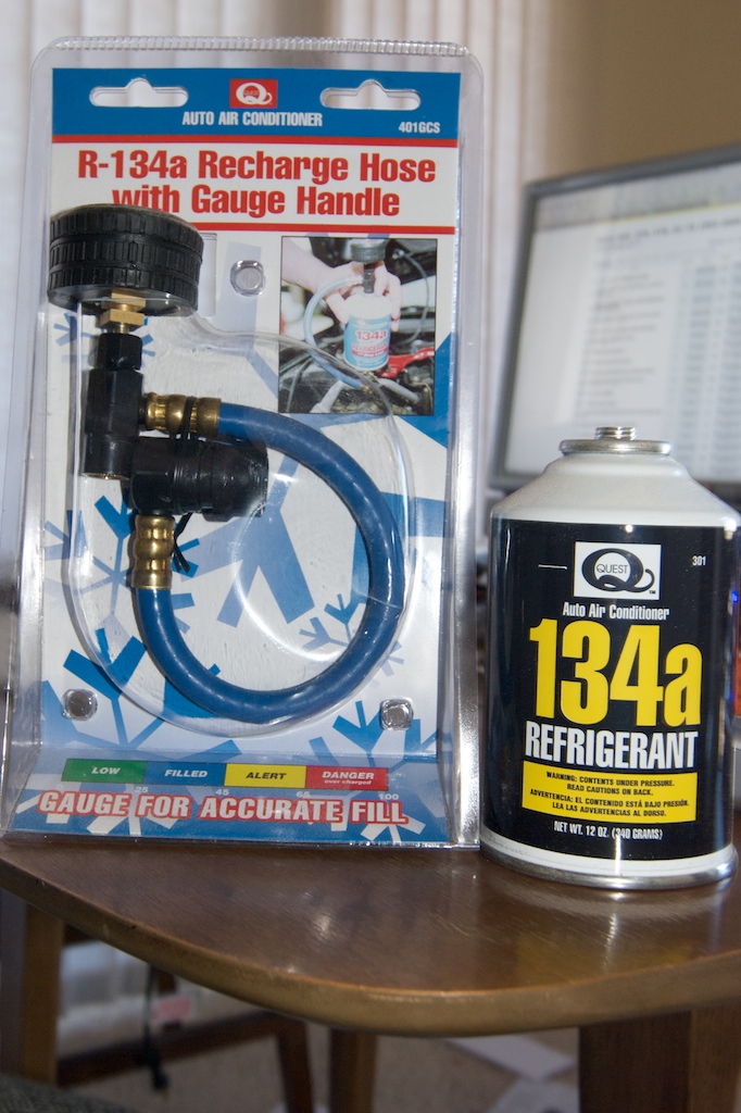 I bought a R134-a recharge hose with gauge, and a can of R134-a. I think the total on that was around $35 US. It was a year ago, so my memory's vague.