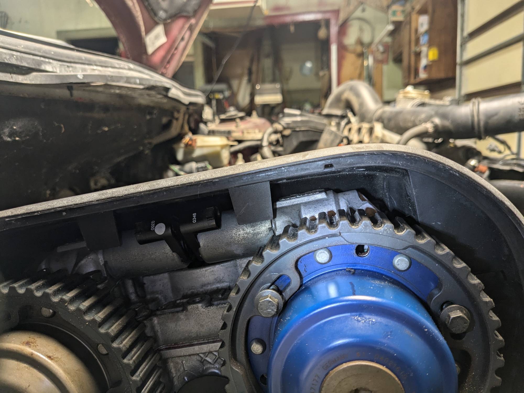 I've got the camshaft locked in place on the driver side of the engine with the Amazon tool. I've also got the chock installed behind the starter that locks the crankshaft in the right place. I had to take the camshaft/vvt gears off while replacing the headgasket but I didn't touch the center torx bolt on the VVT units.