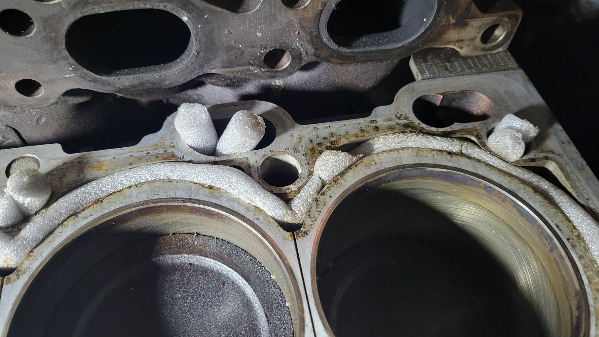 Update on this car, I have the head back from the machine shop with the Volvo steam seals installed, he said the exhaust valves were only holding 8psi in his test, spec was over 20. Valves ground, now cleaning up the block and there are these stains.