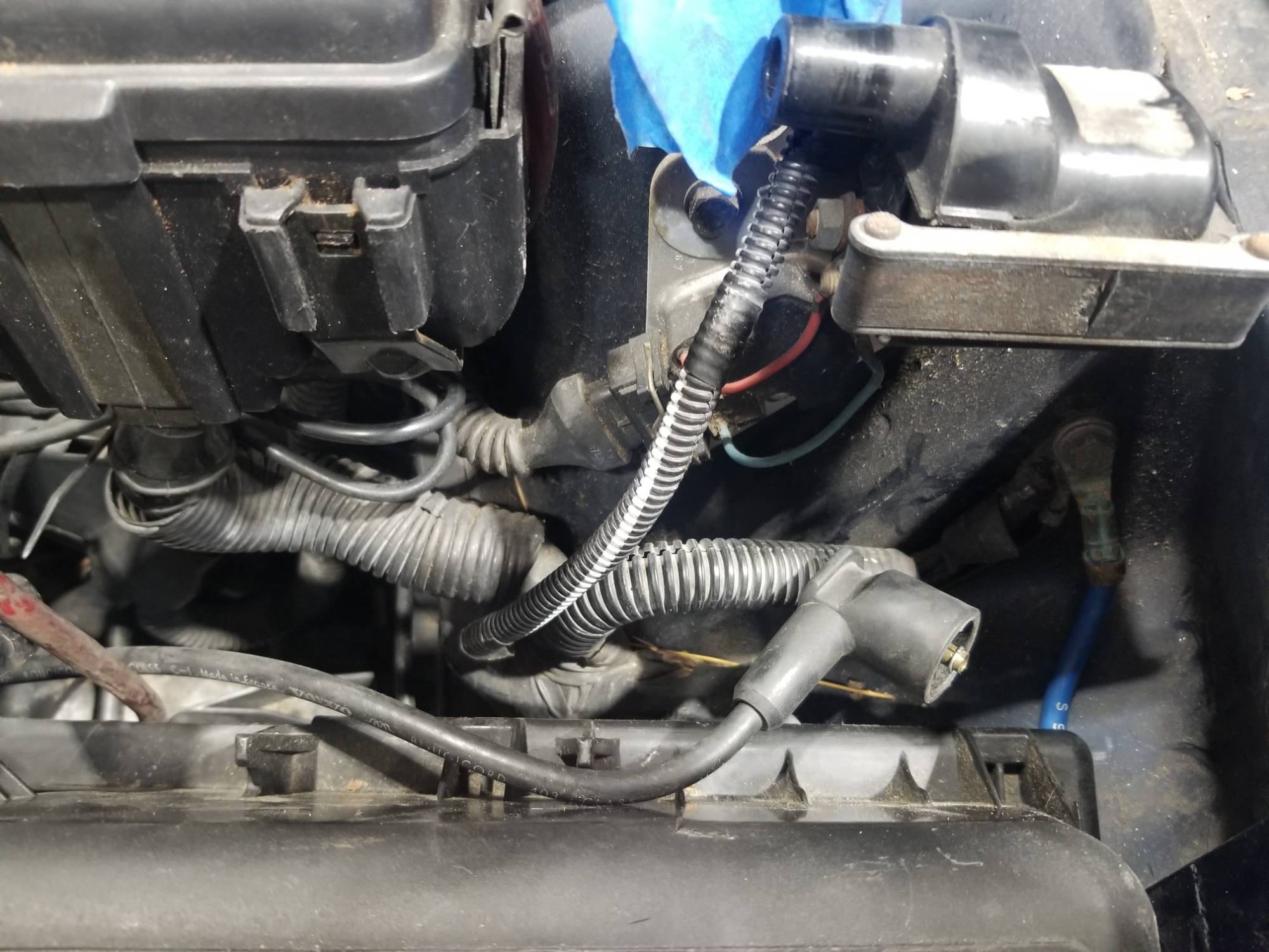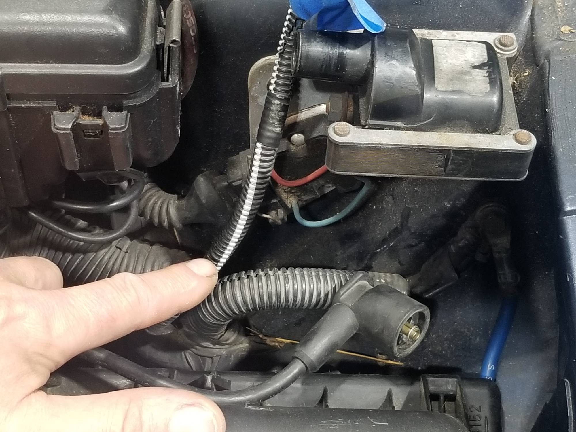 I disconnected the coil wire for safety Its the small guage 2 wire connecter I need help diagnosing its function - black with white stripe flex wire sheath & blue tape in pic