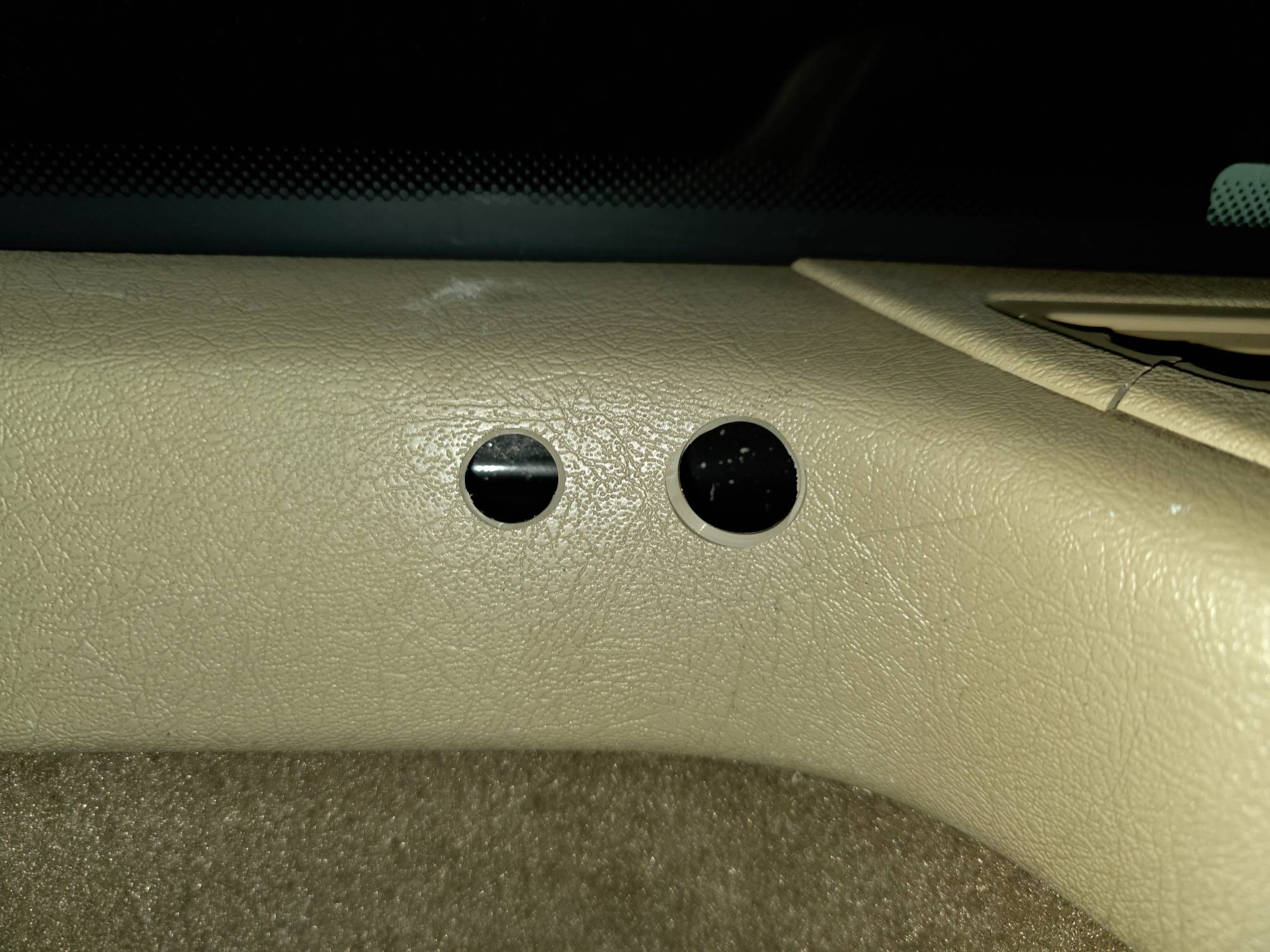 The templates require those pieces of trim with the grilles to be removed as the templates hook onto the trim edge underneath it. Be careful removing them as they have become very brittle, I ended up accidentally snapping the drivers side one in half. I used the method Neil discussed with me about using masking tape and a marker to mark the diameter of the holes and the rough center point using the template. I used a step bit to get the holes as close to 1/2 inch as possible. I then used a 1/2 inch drill bit to clean up the holes and get them accurate.
