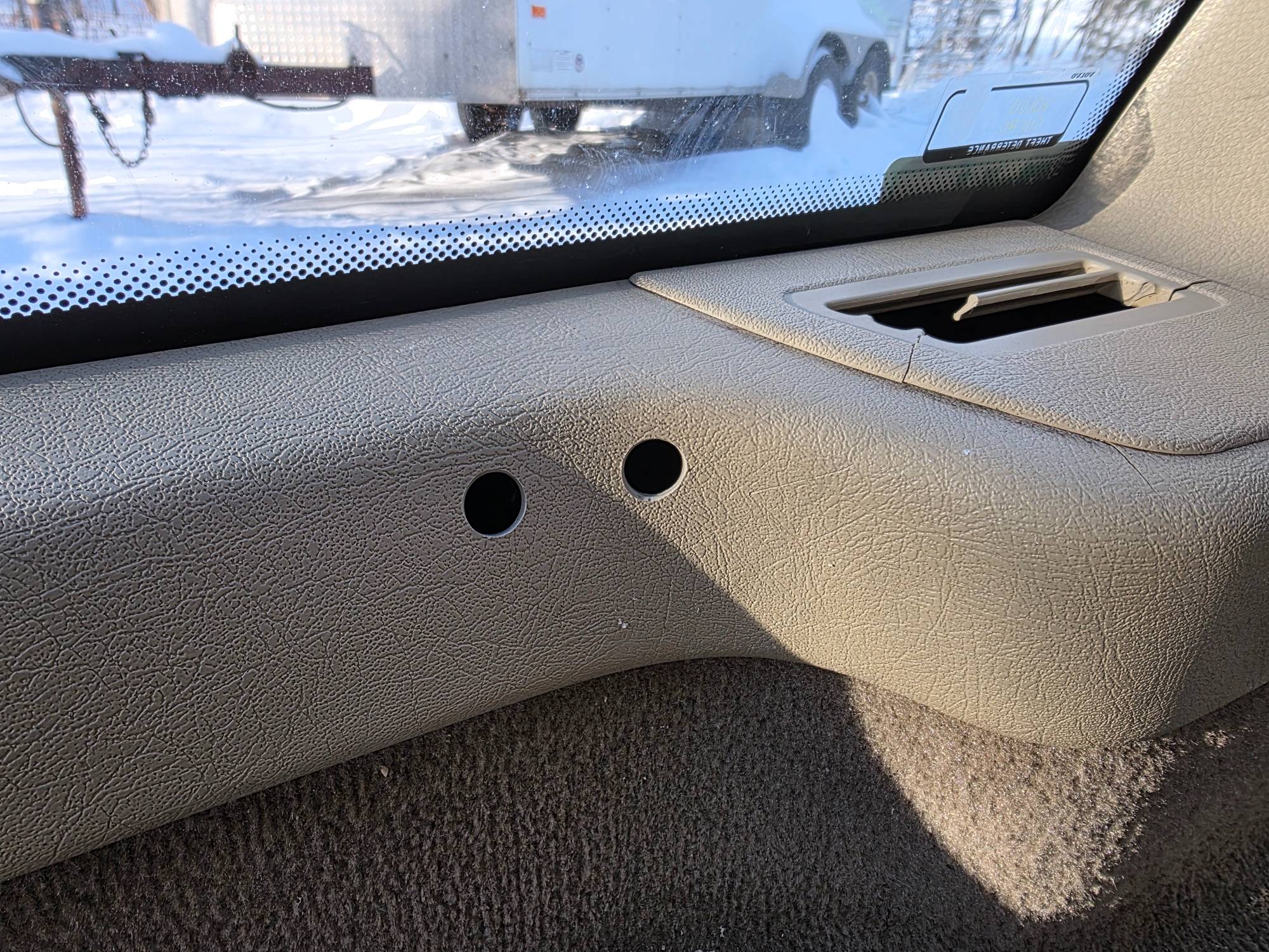 Today I drilled out the holes with a wider step bit from work. This allowed the rearmost feet to go in but the forwardmost feet (located on the curve) still would not go in. It appeared that the holes were too close together. What I ended up doing was drilling out the forward holes even wider with the step bit until the cover could go in all the way. It looks a bit uglier like that now but whatever, the trim was already cracked and broken, as long as it works.