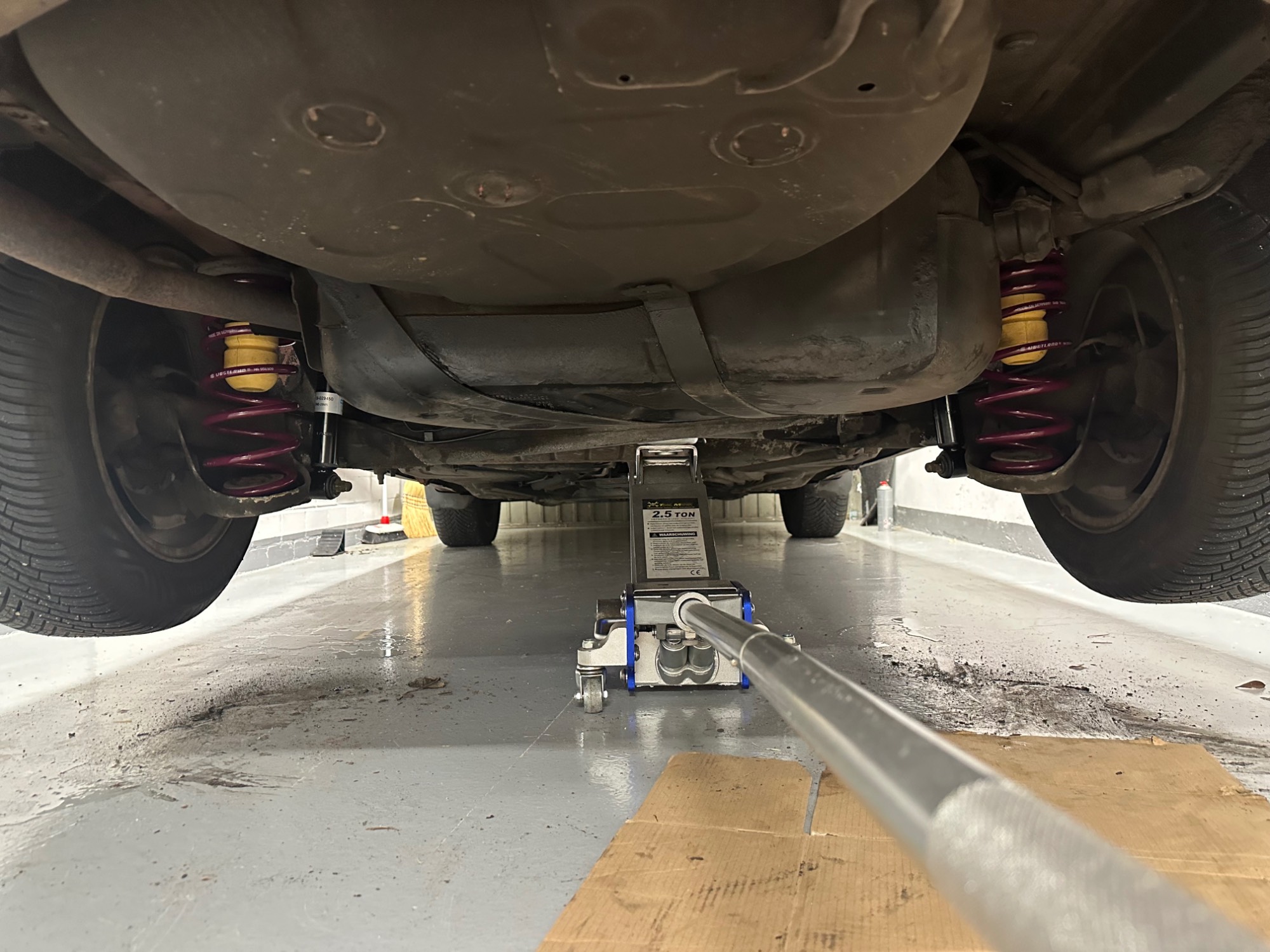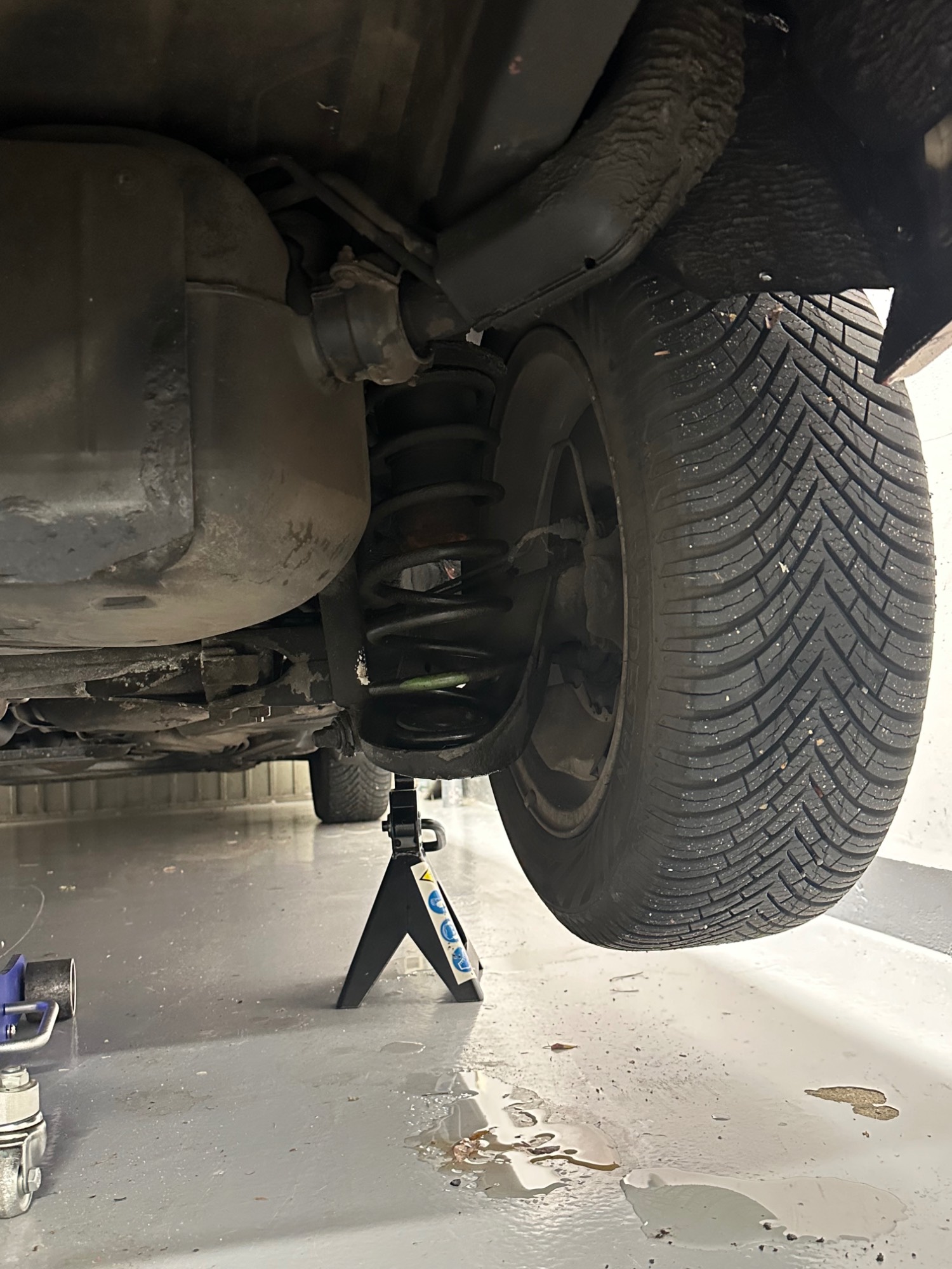 Started it up last night and I was ready to take it to the inspector to make it road legal again but I heard an exhaust leak as soon as I started it up. Just drive it in again and lift it up again, it's right behind the cat where there is a seam. I'll try and put some mig welds over it under the car.