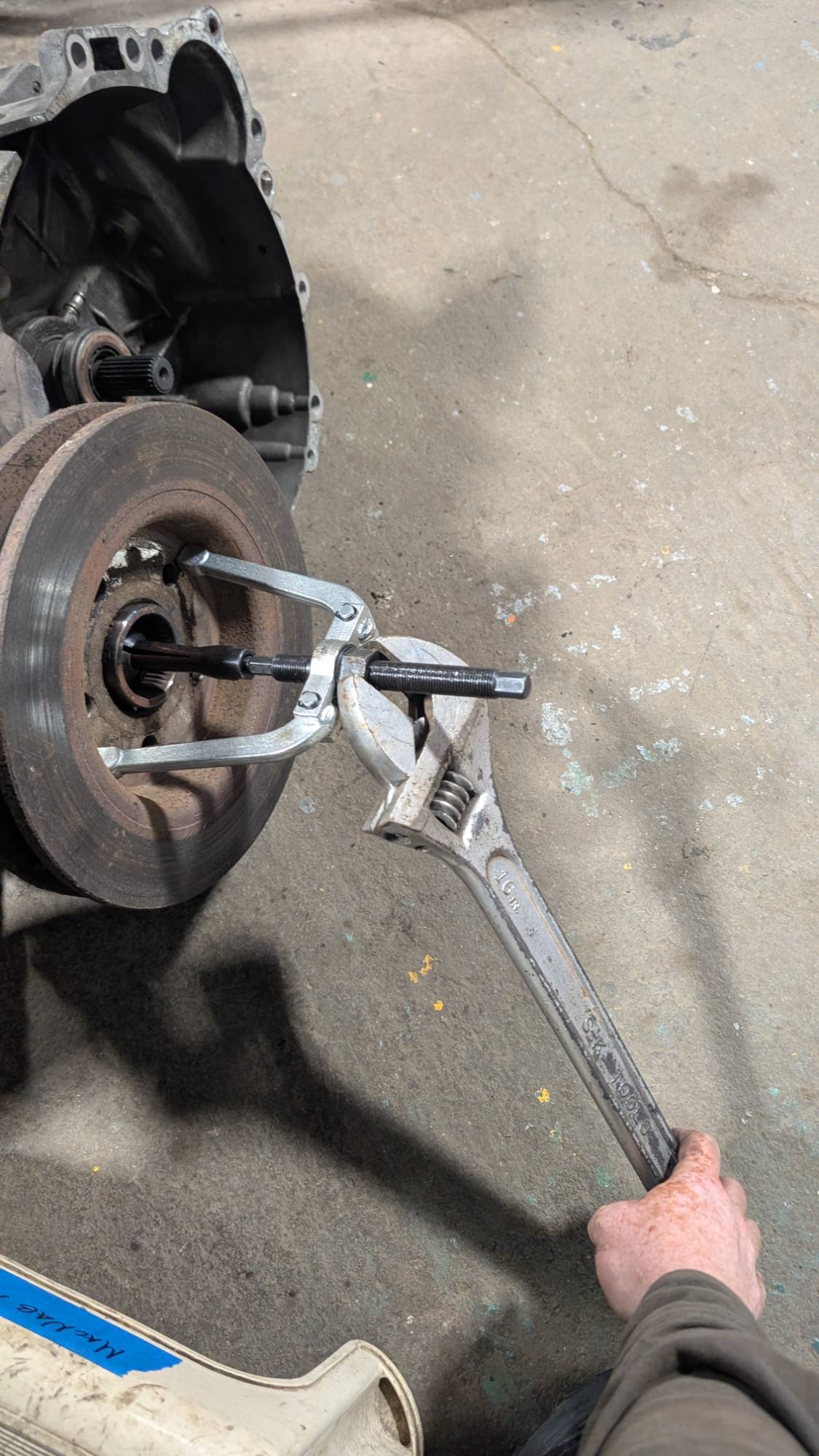 Pulled a collar sleeve on the m66. Used a cheap blind hole puller and an old brake rotor since the stand off was digging into the transmission housing. And a lot of heat.