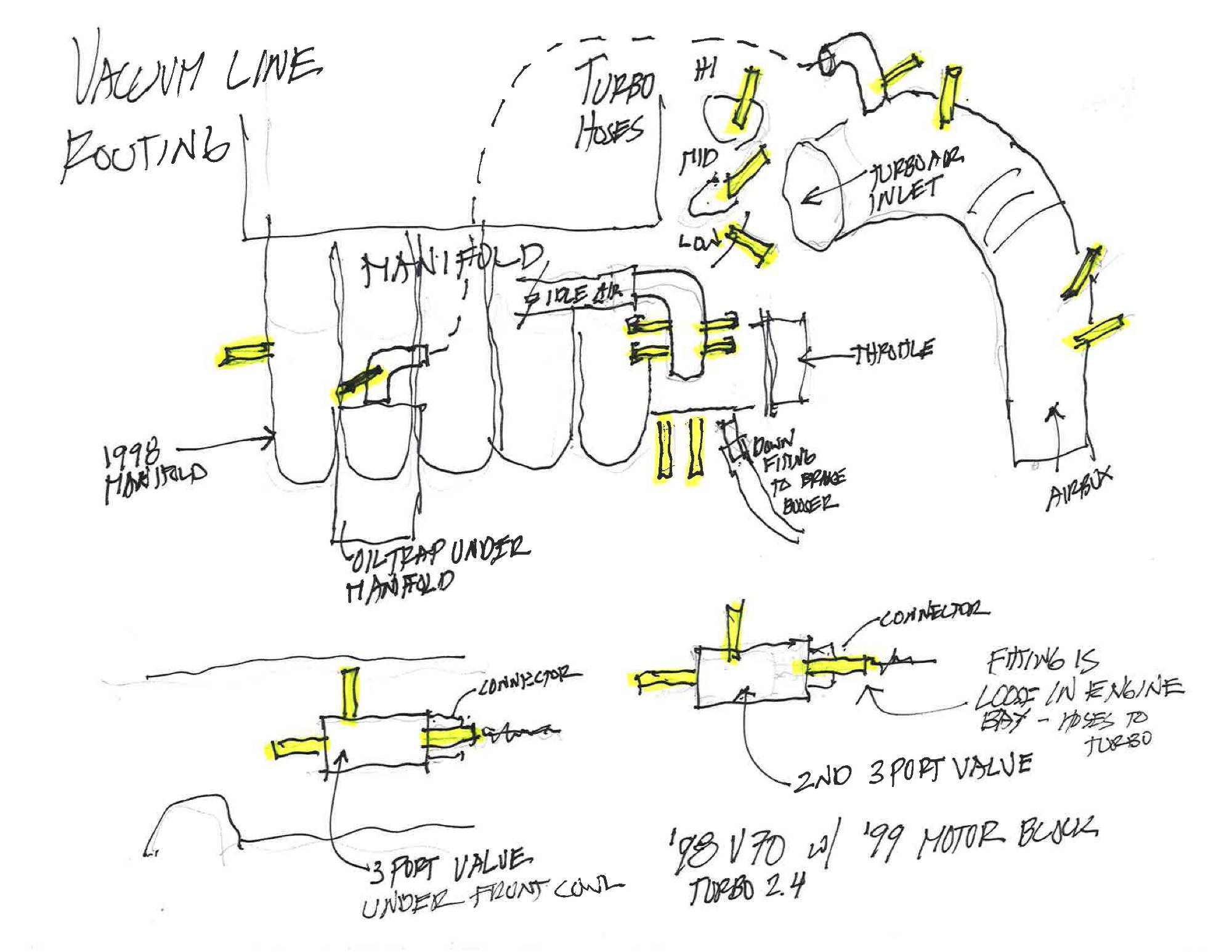 I have a 98 V70 T project car - that started with no engine, and I put a 98/99 T engine in and need help with routing of vacuum lines. I may have extra pieces I dont know about, or missing T's and check valves. I've read every post and still am confused about what goes where. So I drew my own diagram - so if someone could connect the dots I'd be golden. I'm trying to attach it to this post, fingers crossed. John