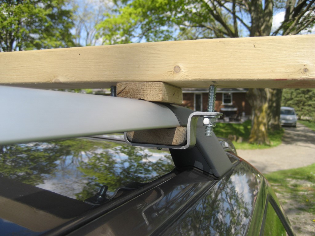 Nope, no 'load fail' on that trip. We spent most time between 70-75 mph, even with some decent crosswinds, and the canoes were rock solid. I added a picture of the mounting details in case someone wants to rig up something similar. The scraps of hardwood flooring had nice grooves in the underside that were spaced such that they fit snugly on the bottom of the stock roof rails. Another piece of hardwood flooring was used on the top, just to shim the 2x4 up a bit. The front shims were tapered to fit the down-sloping roof rails while keeping the 2x4 horizontal to match the rear.