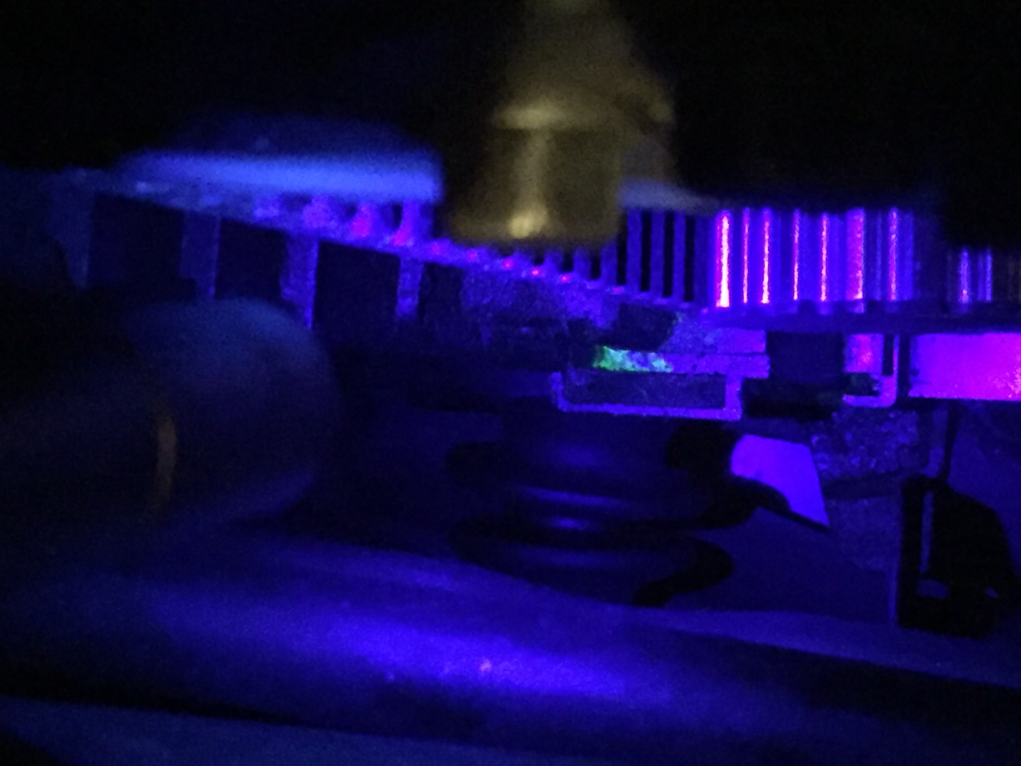 Here is a picture of the leak behind timing belt cover - a bit hard to see but it is a little right of center in the photo. This is looking down on timing belt & water pump gear. The fluorescent drip shown is in the pocket of TB cover where the tab from front cover fits when you slide it into place. That area of the cover is below the pump but not accessible to the pump if I'm seeing it correctly - hard to tell from above.