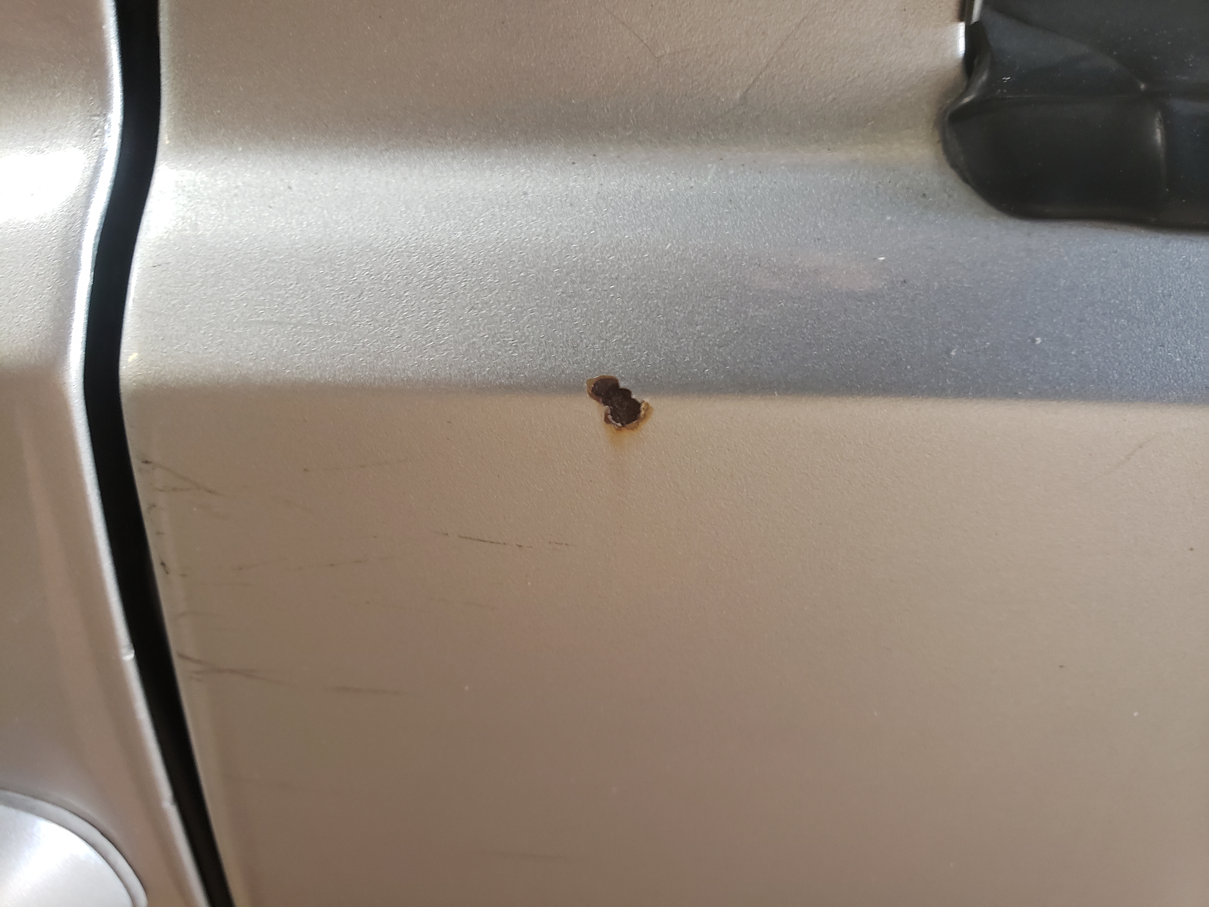 Good point, and I grew up in NY so I know of what you speak. But my previous car, Tito, got a couple of rust spots on the roof that I ignored. Who'd a thunk they'd get worse? Well this past winter (and here in Northern California, "winter" means "rain") those rust spots turned to leaks. Right over my girlfriend's seat of course, which led to a very grumpy girlfriend. So at this point at least I'm trying really really hard to be rust free.You have to be a Californian to call that ding, “ rust”