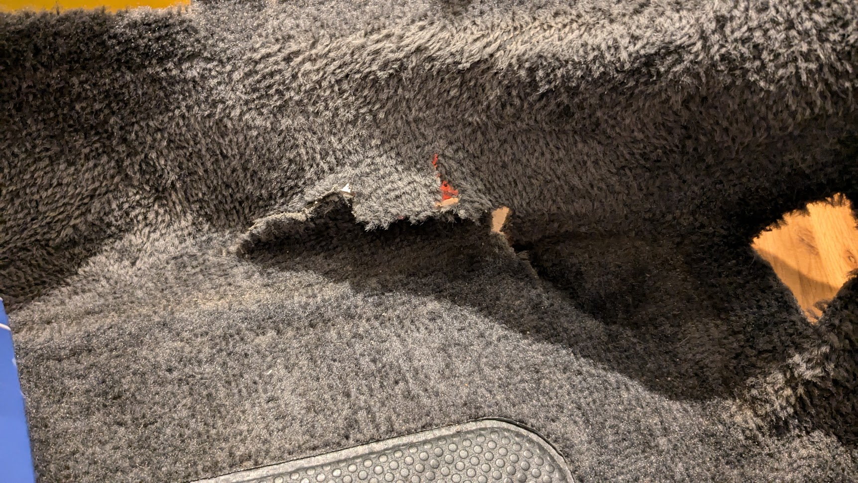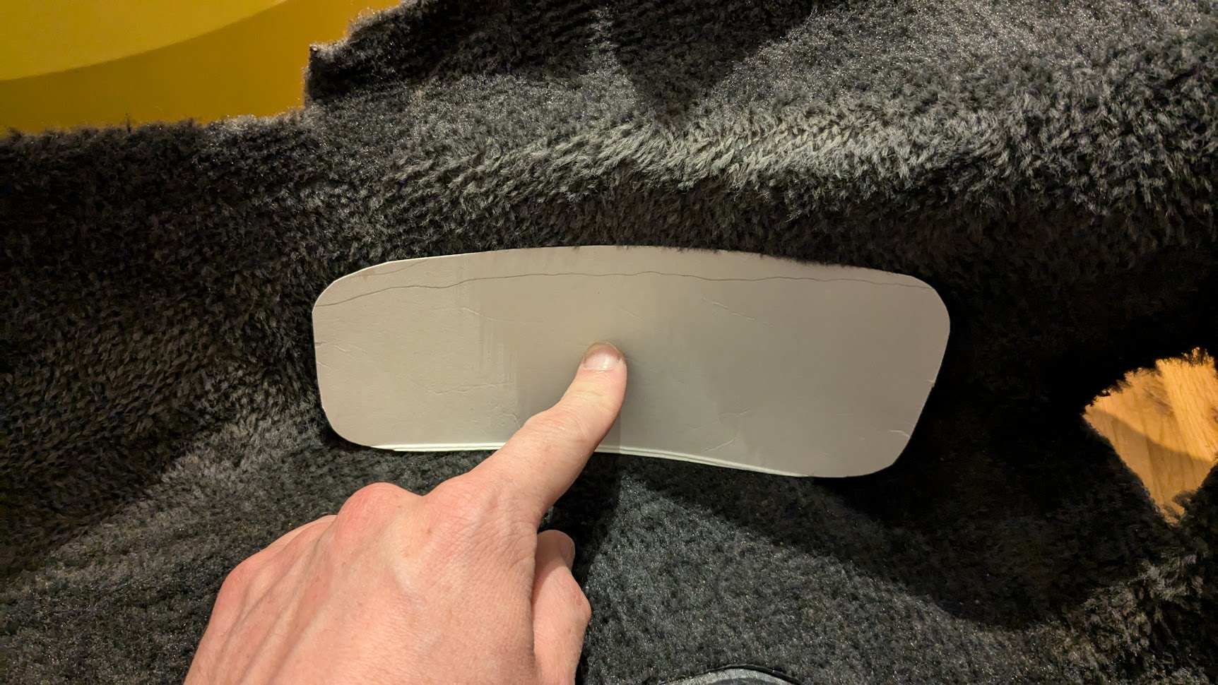 The decision was made to 3D print a patch. 3D printing is something I am familiar with, working with carpet isn't, so this promised to give the best result. The first prototype was printed from PLA, because it is much cheaper and much faster to print than flexible materials. The final patch is made from TPU with a Shore hardness of 95A. The prototype fit very well, so the final patch was printed the next day (it took nearly 5 hours instead of 1 hour).