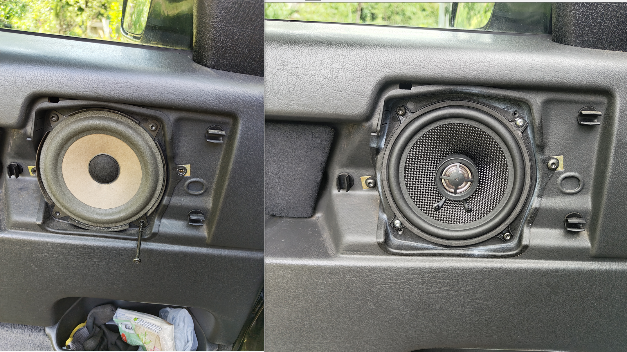 After updating the dash and rear speakers I did the doors today. Meh, I hate audio work, nothing fits, I had to resize the adapters etc. But I think it came out good. Not sure if it was worth the work (2 days for all 8 speakers), but it is done.
