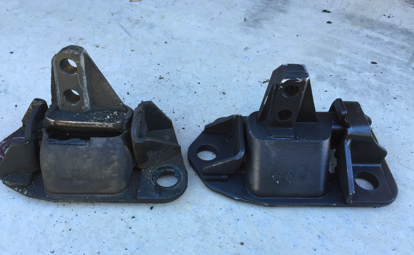 I was all worried about my timing marks but there was no need. They were very clear, in fact there were white marks in addition to the factory stamps in the cam gear. This was odd as I didn't think my belt had ever been changed. As for the crank marks, I had two to go by. There was a line on the crank pulley that lined up with the belt when the timing was correct. It was very clean in my engine and the mark was easy to see. Also on the crank gear itself, I had two notched teeth and then a mark on the engine block that sat in between the notched teeth. Again, super easy to see. There was no need to worry. I had read that the timing belt cover around the crank was hard to get to. After jacking up my car, I could see them clear as day. Here's a picture of the 2 bolts on the right of the crank. As mentioned, my engine mount was good and broke. I replaced it and it gave me additional working space. You can see the old mount on the left here. It was basically resting on the frame as the rubber had broken clean through. Having the mount out of the way and jacking the engine up a bit gave me a bit more room to work the belt out. I didn't have much trouble at all. In this picture I am getting at the lower water pump bolts with my socket. You can also see the 2 holes for the bolts for the engine mount just below the crank to the left. As for the T45 tool to remove the tensioner pulley, I simply wedged a piece of wood in there and then used a 8mm open end wrench to get the bolt off with no slippage. I saw that trick somewhere on this forum. Finally, when I replaced my water pump the gasket came off pretty cleanly with the pump. Putting the new gasket on was easy. There are 2 locator pins on the block. I just hung the gasket off of those pins when I put the new pump on. It was simplicity itself! So that was my experience. With the engine mount, it took me about 5.5 hours to finish the job. I only had one annoying event and that was the 10mm bolts for the timing belt guard on the engine block. I thought I had rounded the bolt head until I got at the bolt from another angle. Thank goodness it was fine.