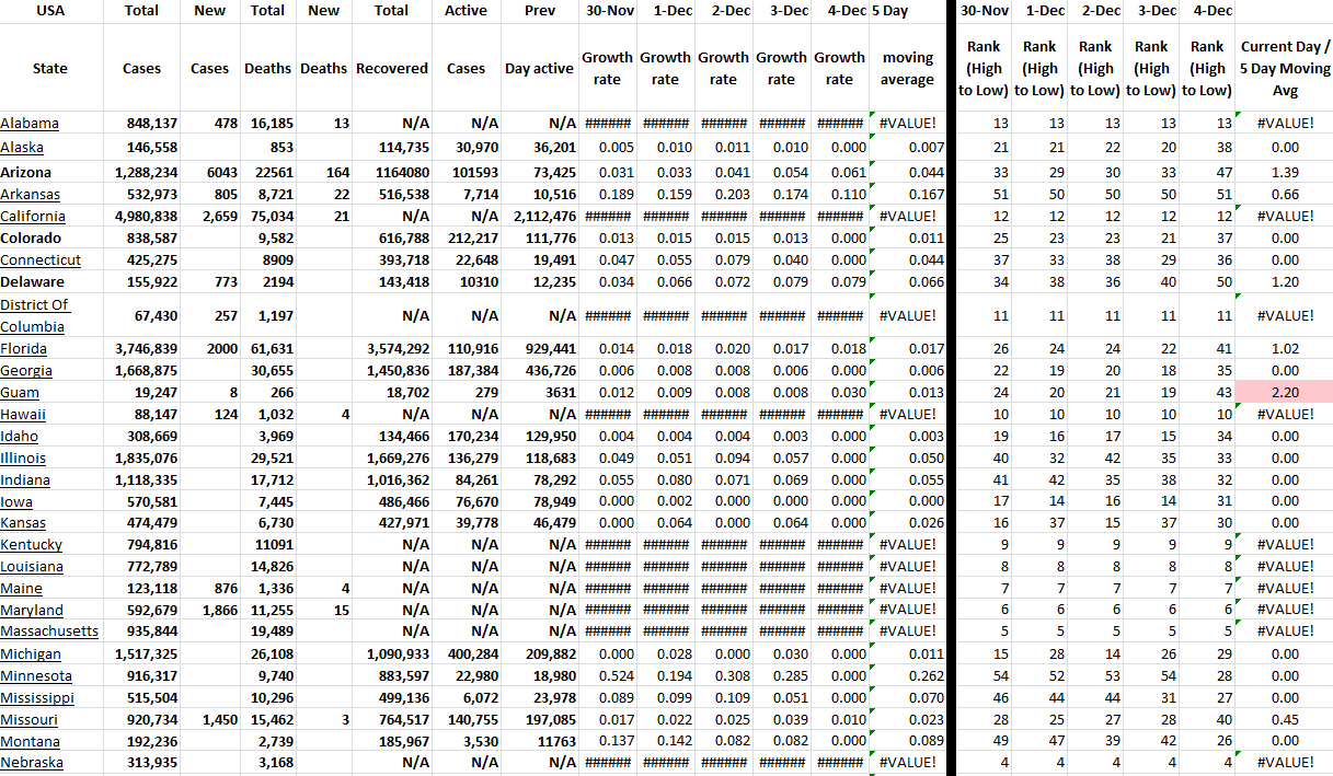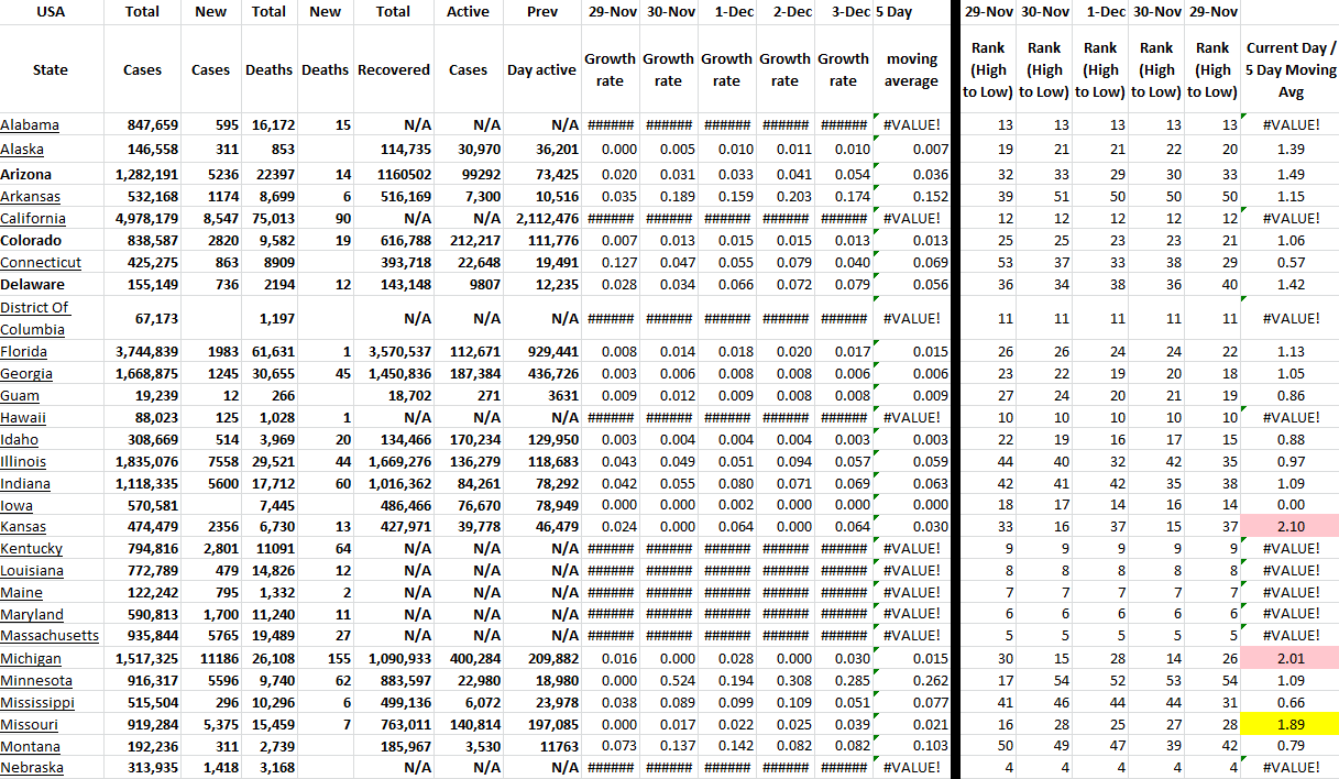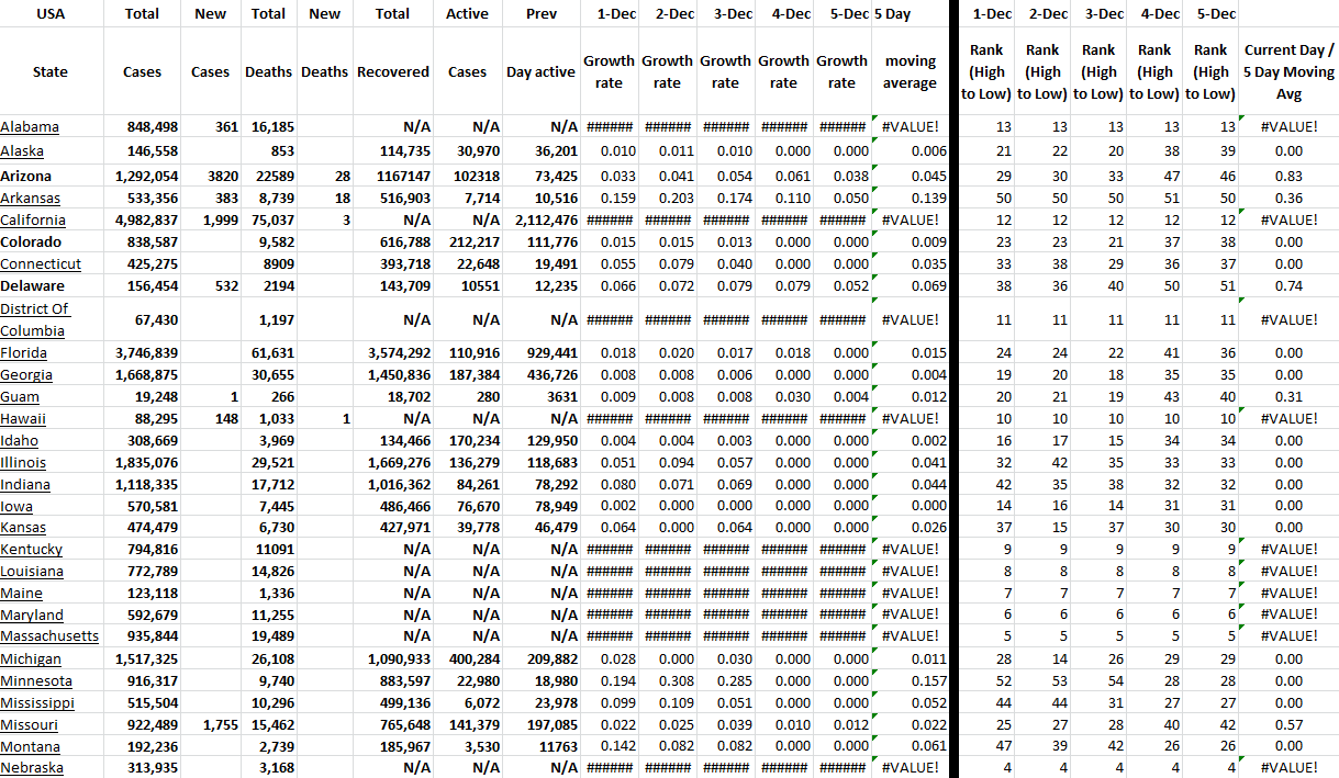 These tables show all available US states and territories and the COVID-19 data for the last 5 days. I have sorted the states alphabetically and added growth rates for last several days for all states with ranking of each day. Of course, this information changes daily. I have presented the table in two parts because of the screen shot, but it is actually one table in Excel.