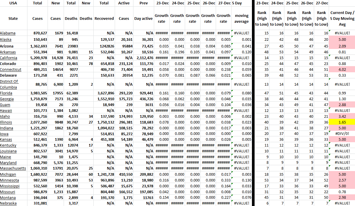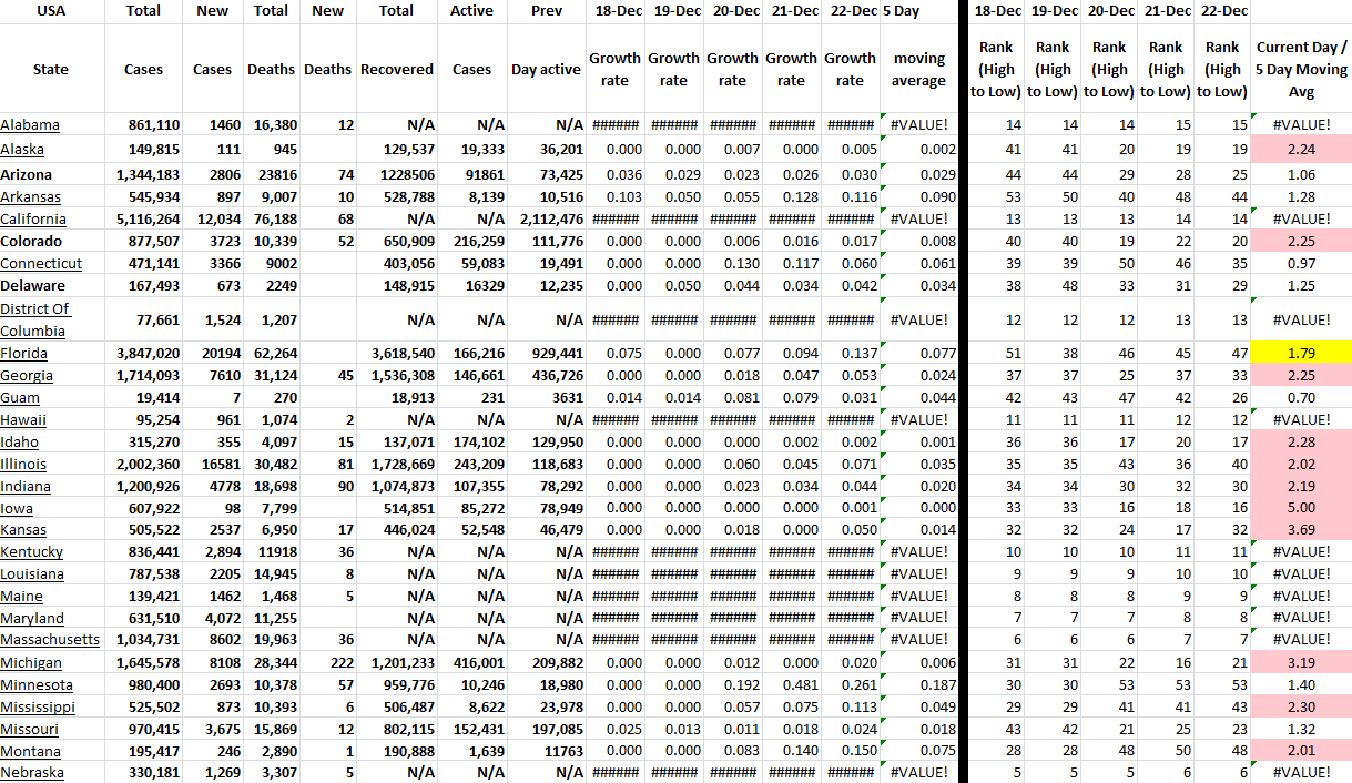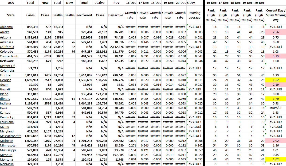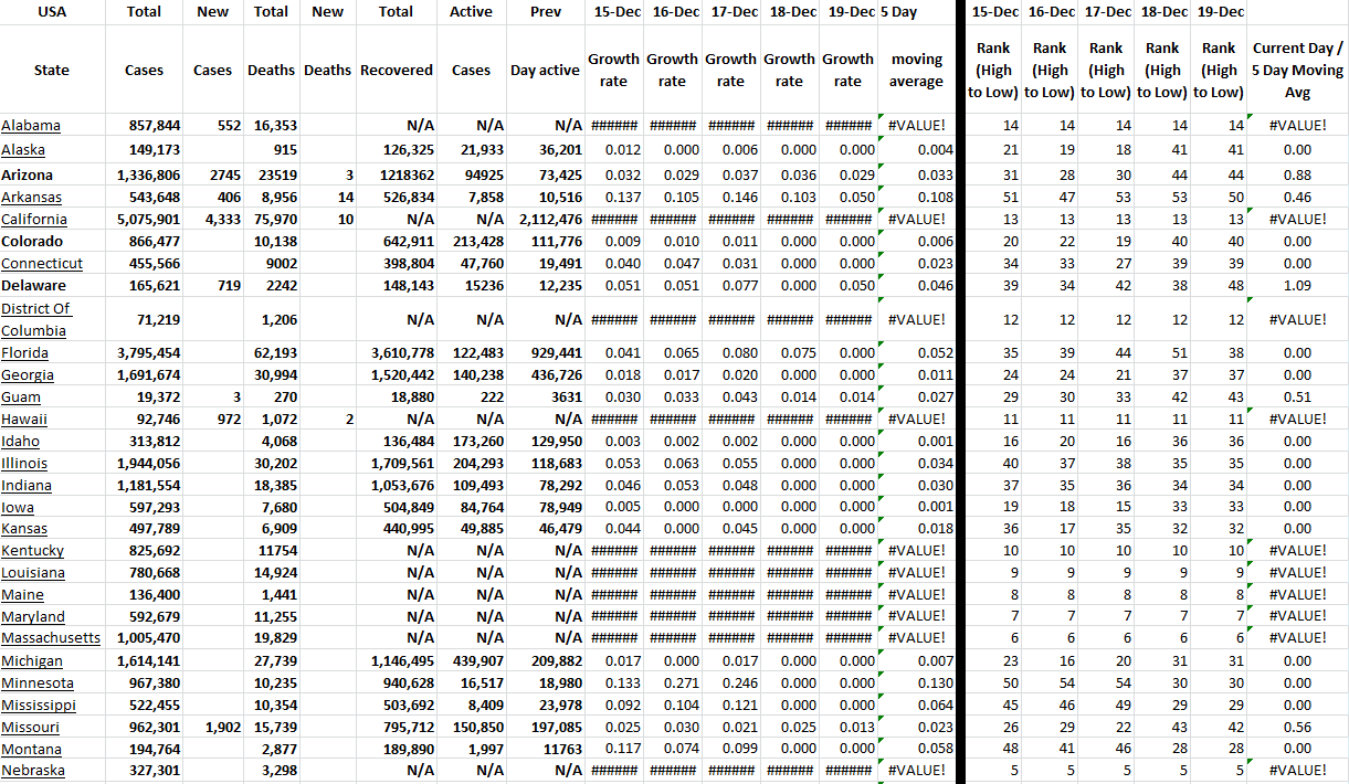 These tables show all available US states and territories and the COVID-19 data for the last 5 days. I have sorted the states alphabetically and added growth rates for last several days for all states with ranking of each day. Of course, this information changes daily. I have presented the table in two parts because of the screen shot, but it is actually one table in Excel.