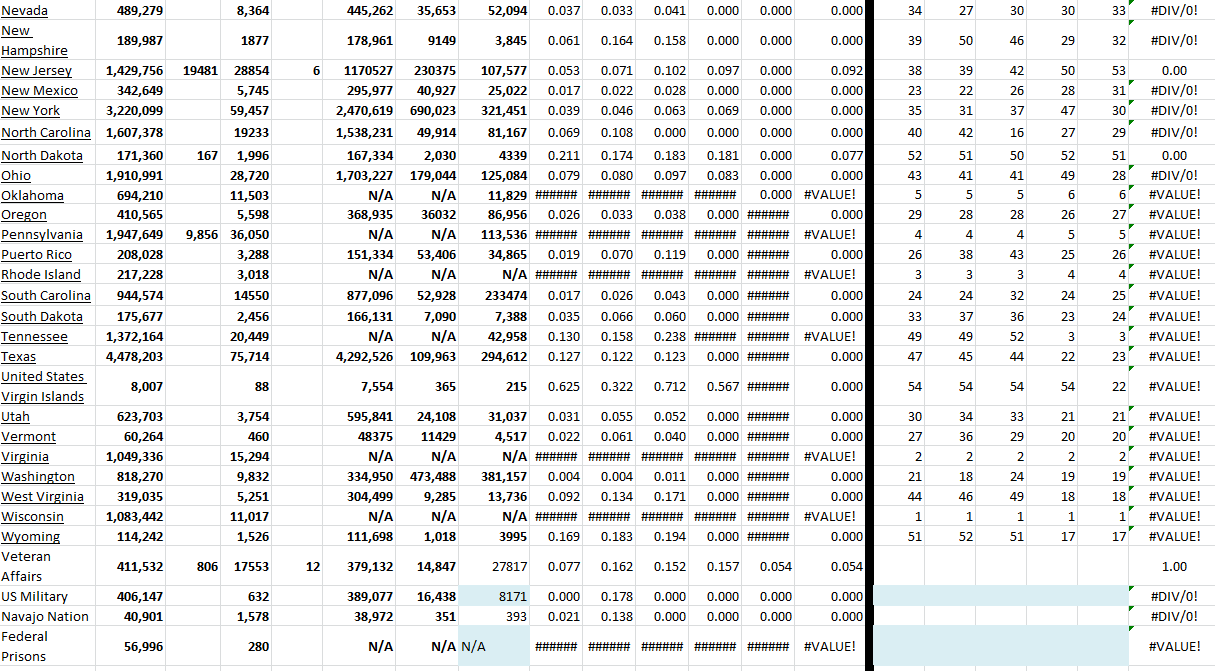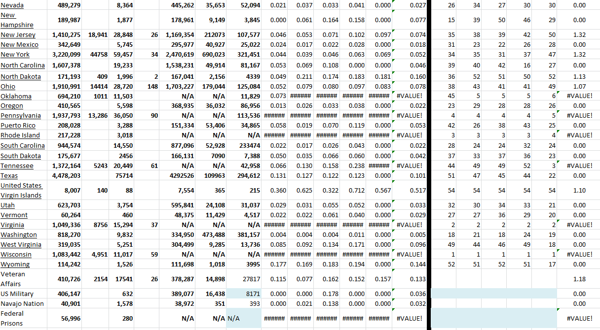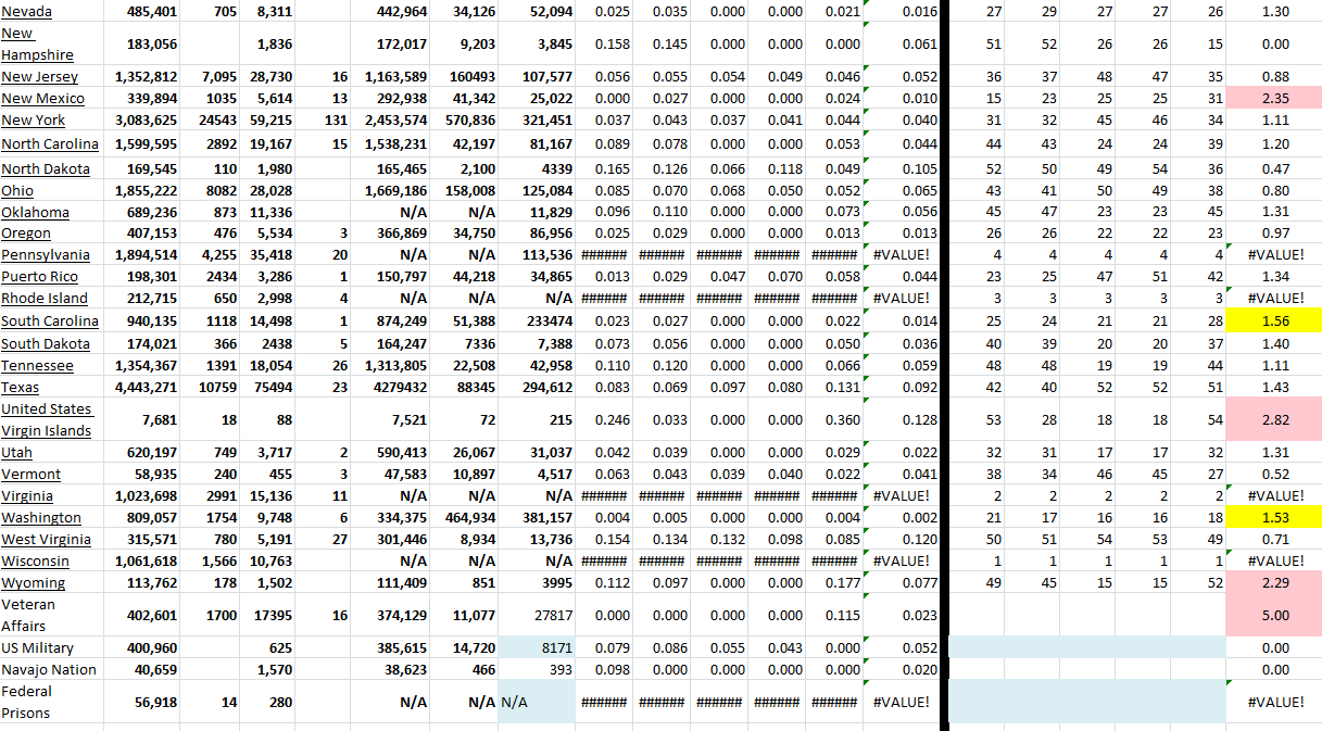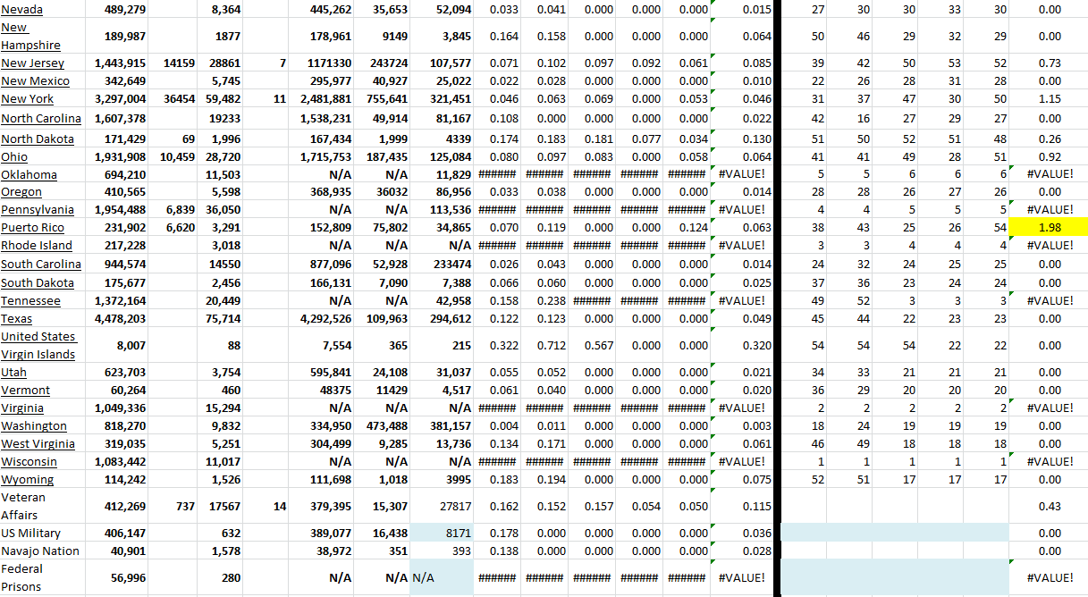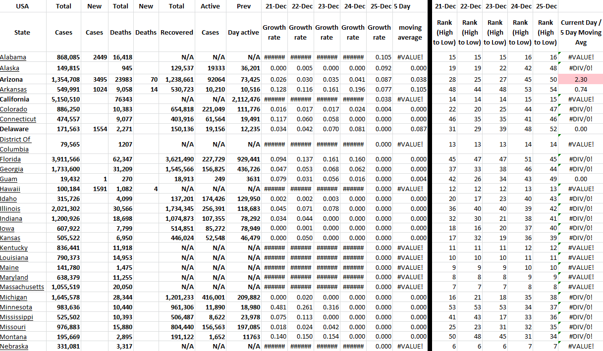 These tables show all available US states and territories and the COVID-19 data for the last 5 days. I have sorted the states alphabetically and added growth rates for last several days for all states with ranking of each day. Of course, this information changes daily. I have presented the table in two parts because of the screen shot, but it is actually one table in Excel.
