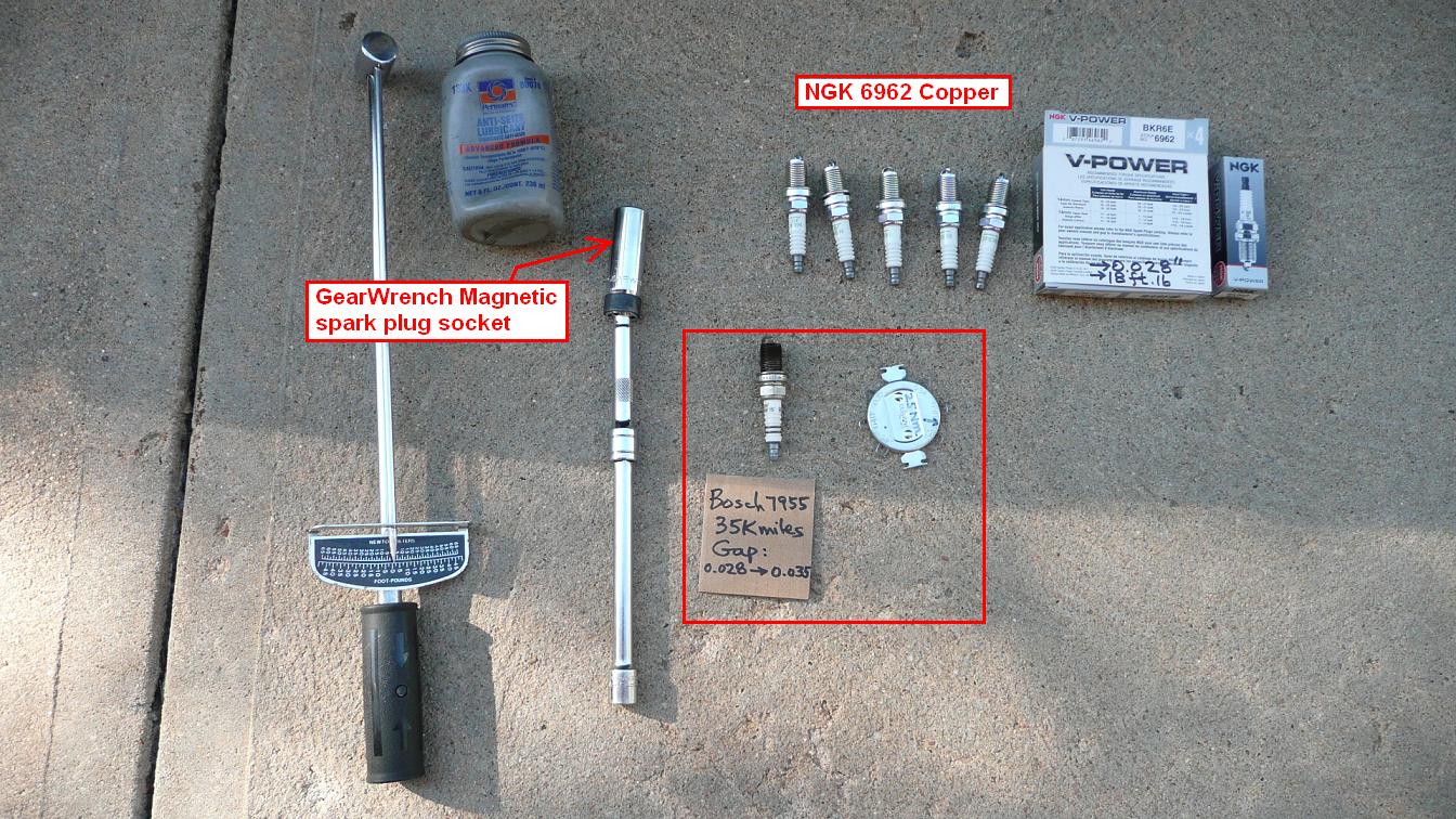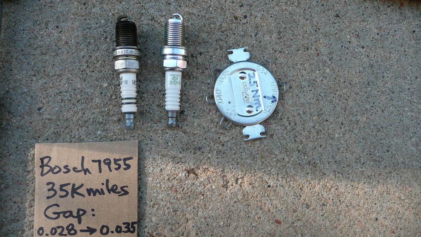 - Old plugs are Bosch 7955 with 35K miles on them, the gap has gone from 0.028" ---> 0.035". Not too bad for 35K miles.
