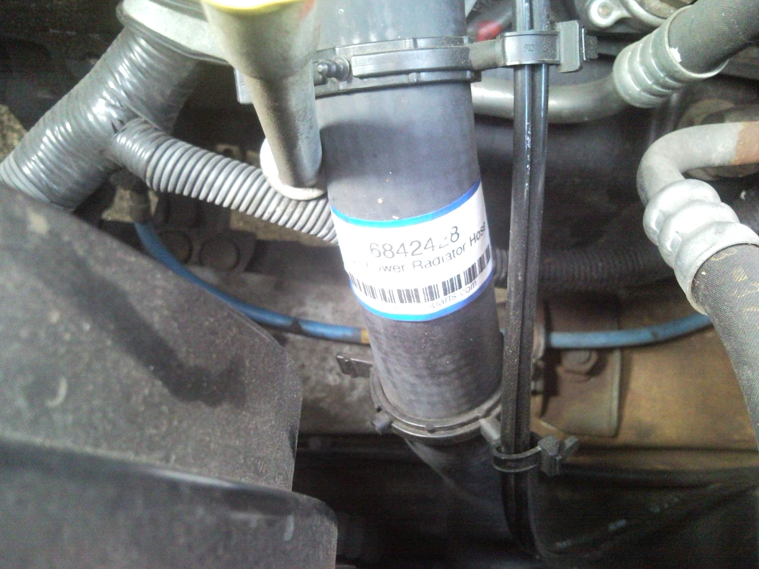 It seems like the wiring harness has a support to keep the hose in position (blue arrow). I think if I loosen the hose clamps at each end I can rotate the hose to make it more to the left in the photo.