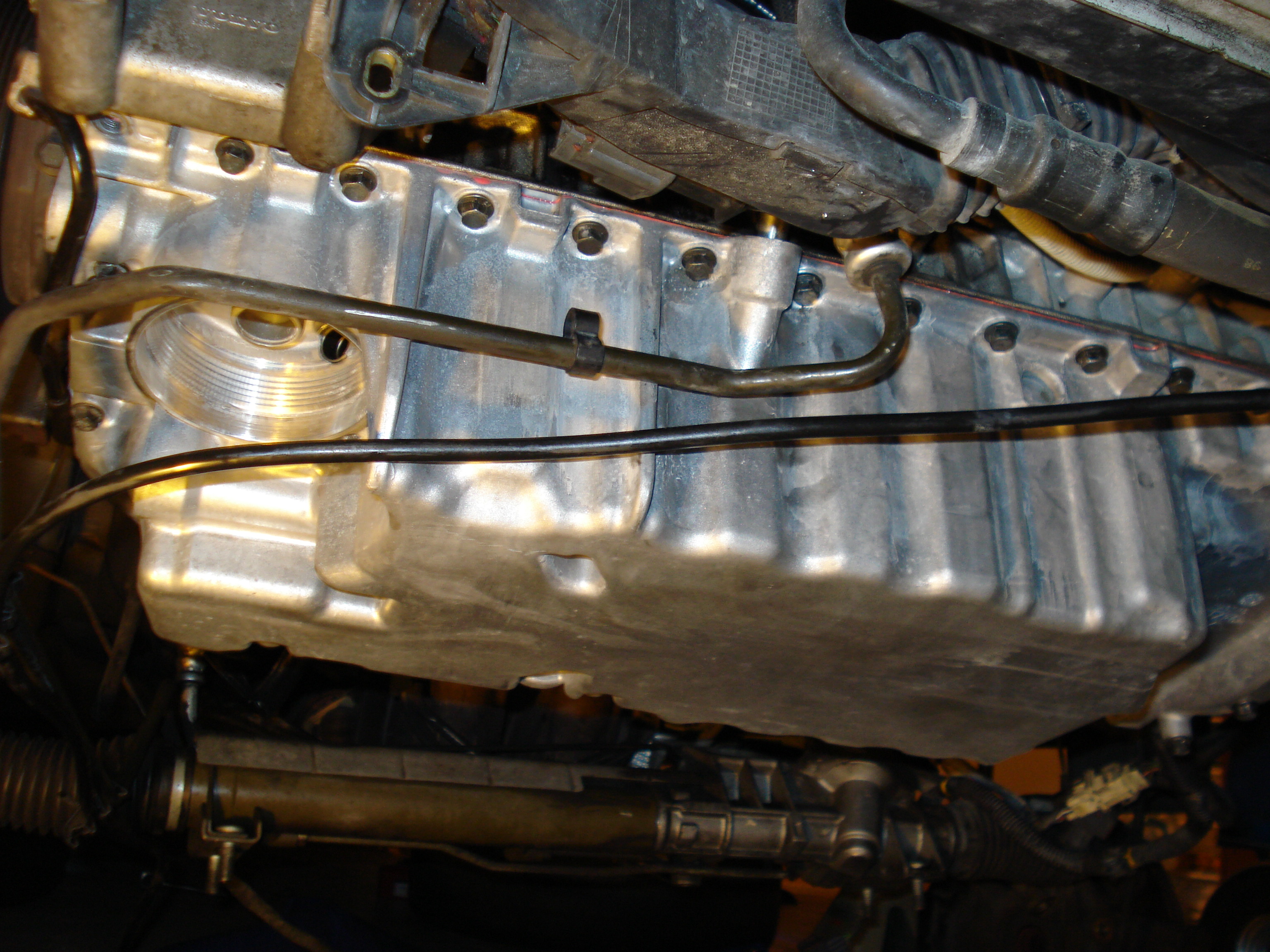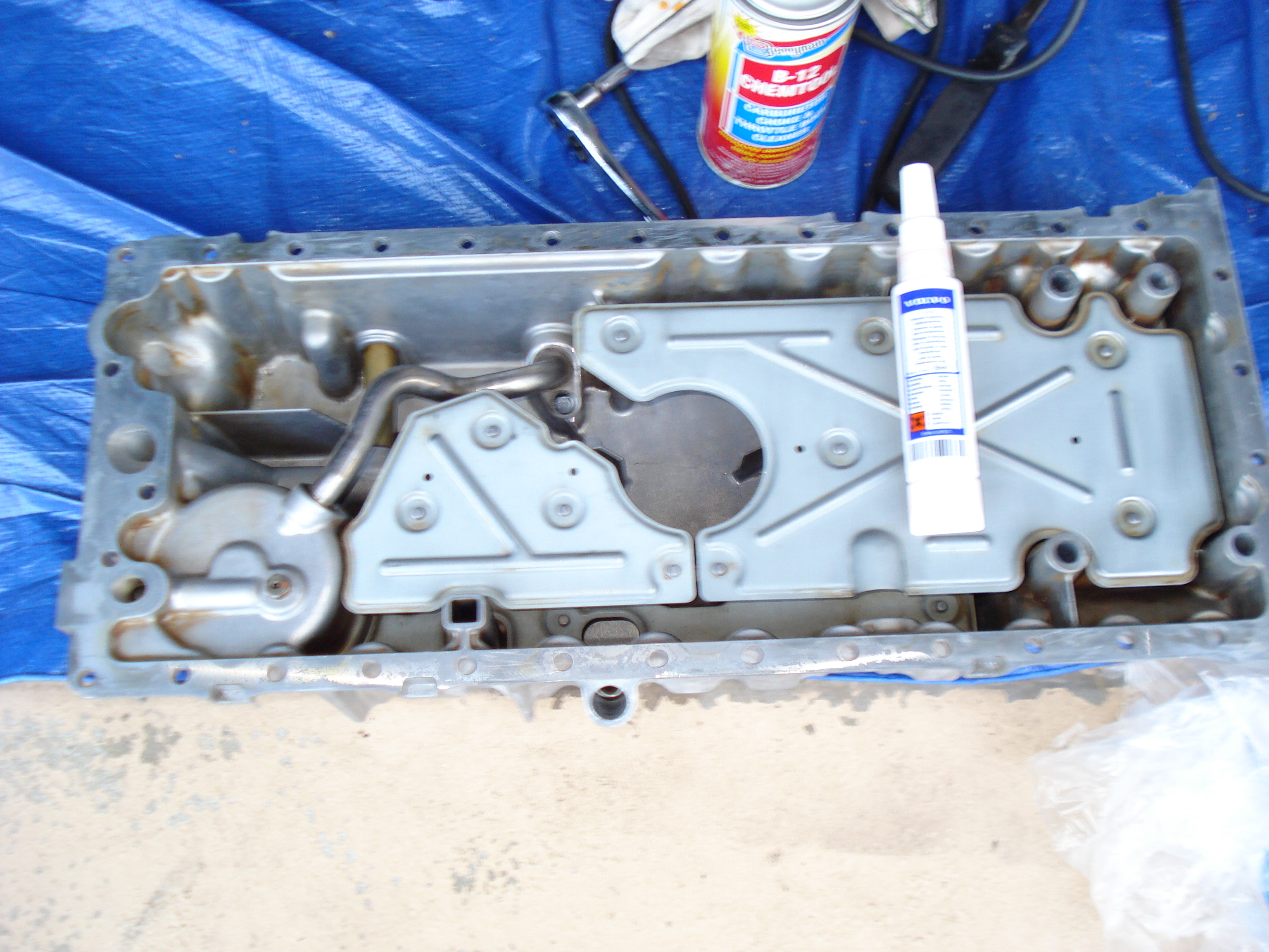 so i installed the freshest oil pan using the Volvo liquid gasket/sealer. Im attaching some pix of the oil pan and the before and after the gasket which was rolled on with a paint roller. torqued it all down , BUT i cant believe the very last bold by the oil pump kept spiining, only to find out it got stripped, i dont know why, i was very careful, so now after all this careful and long day i have to tap new threads into the pan and possibly use 1 size larger bolt.