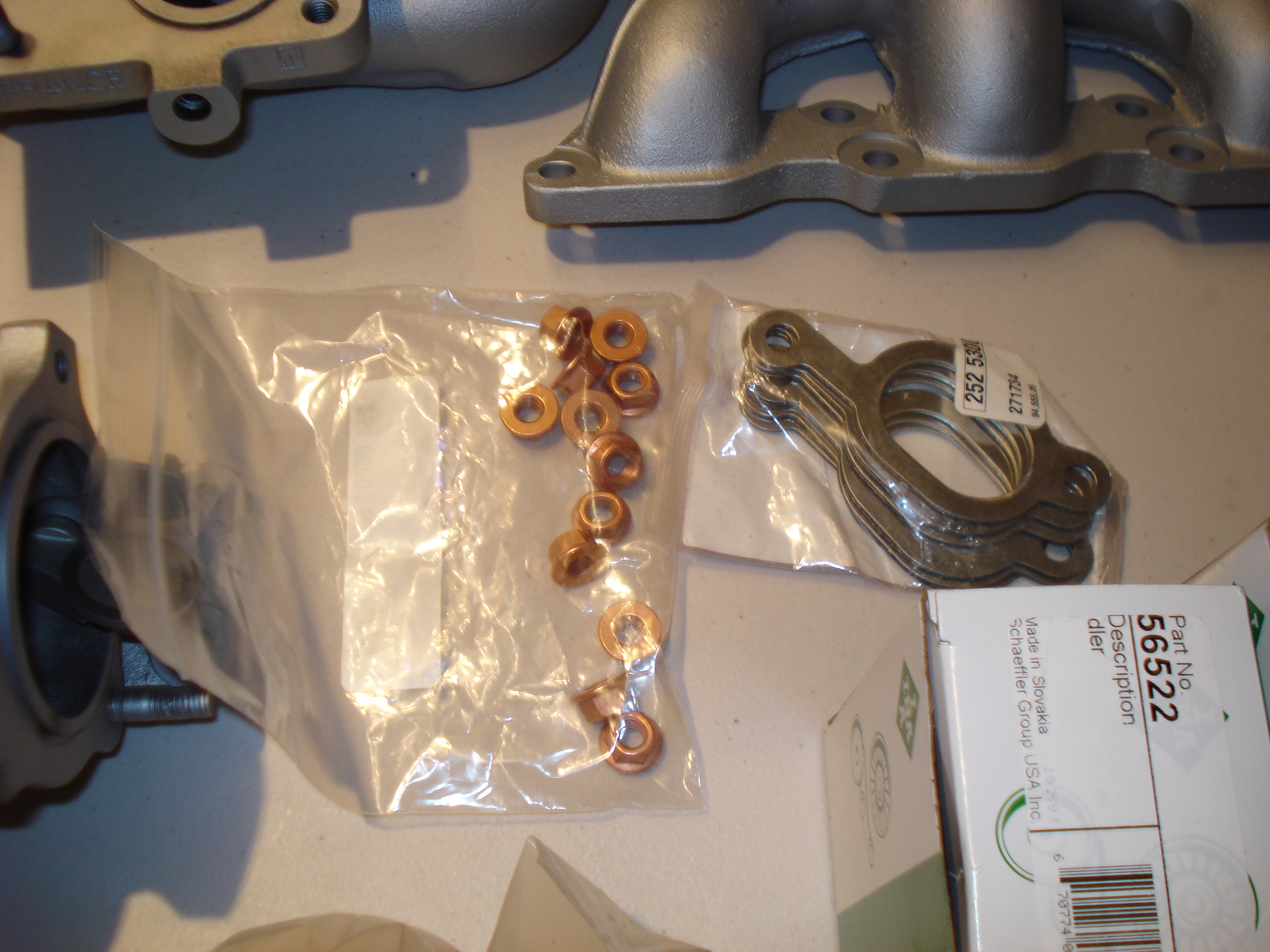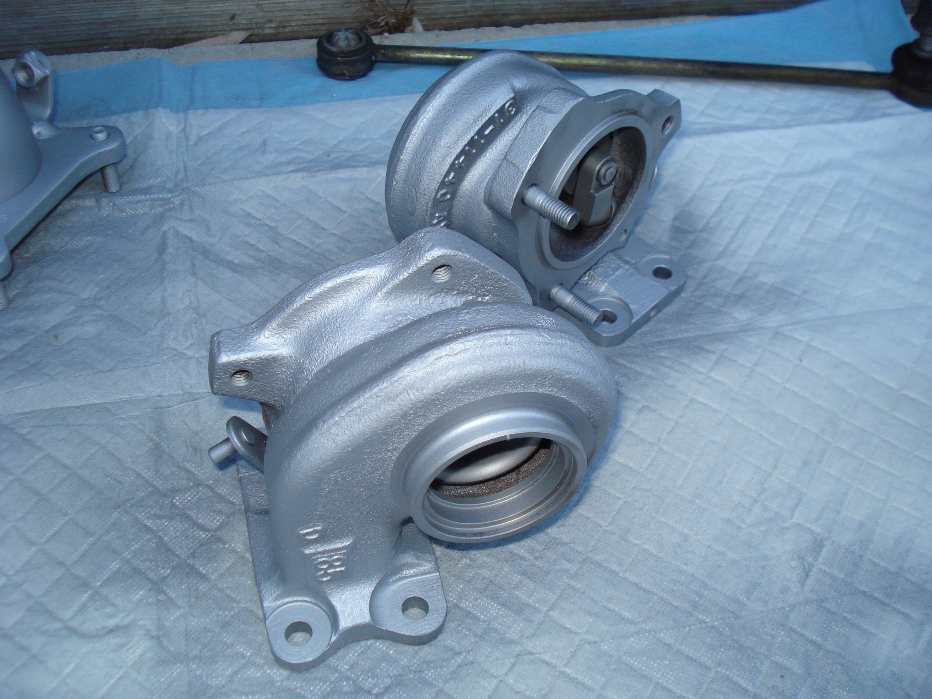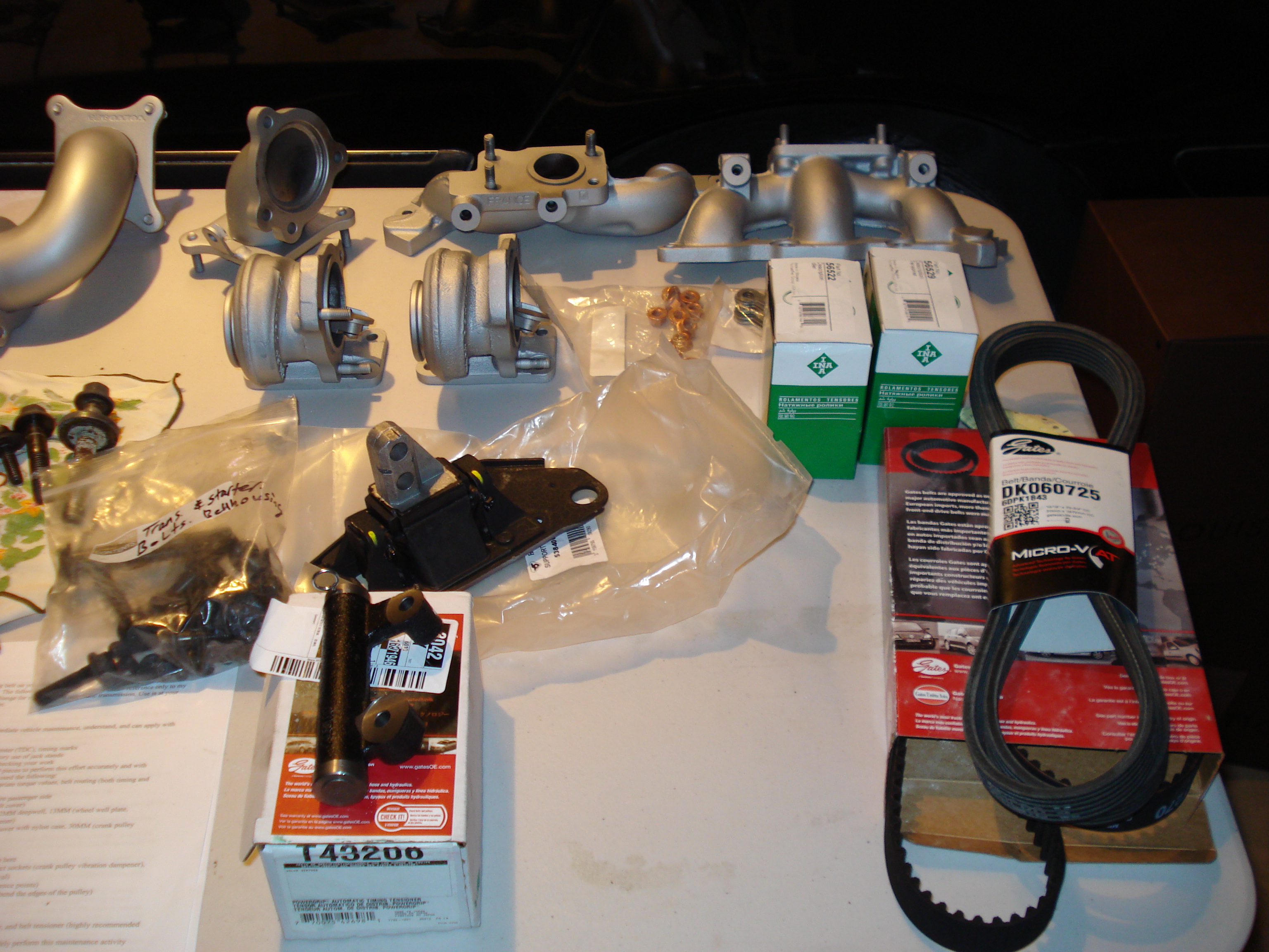 with the turbo's and ex. mani. off, going to sand blast them this week, both turbo's are dismantled, going to buy some replacement bearings ans seals, subframe bushings are here, sway bar links, all new exhaust gaskets , ordered some new exhaust mani nuts and a new dip stick, ya mine broke, oh and 2 new seals for the oil cooler. stay tuned..