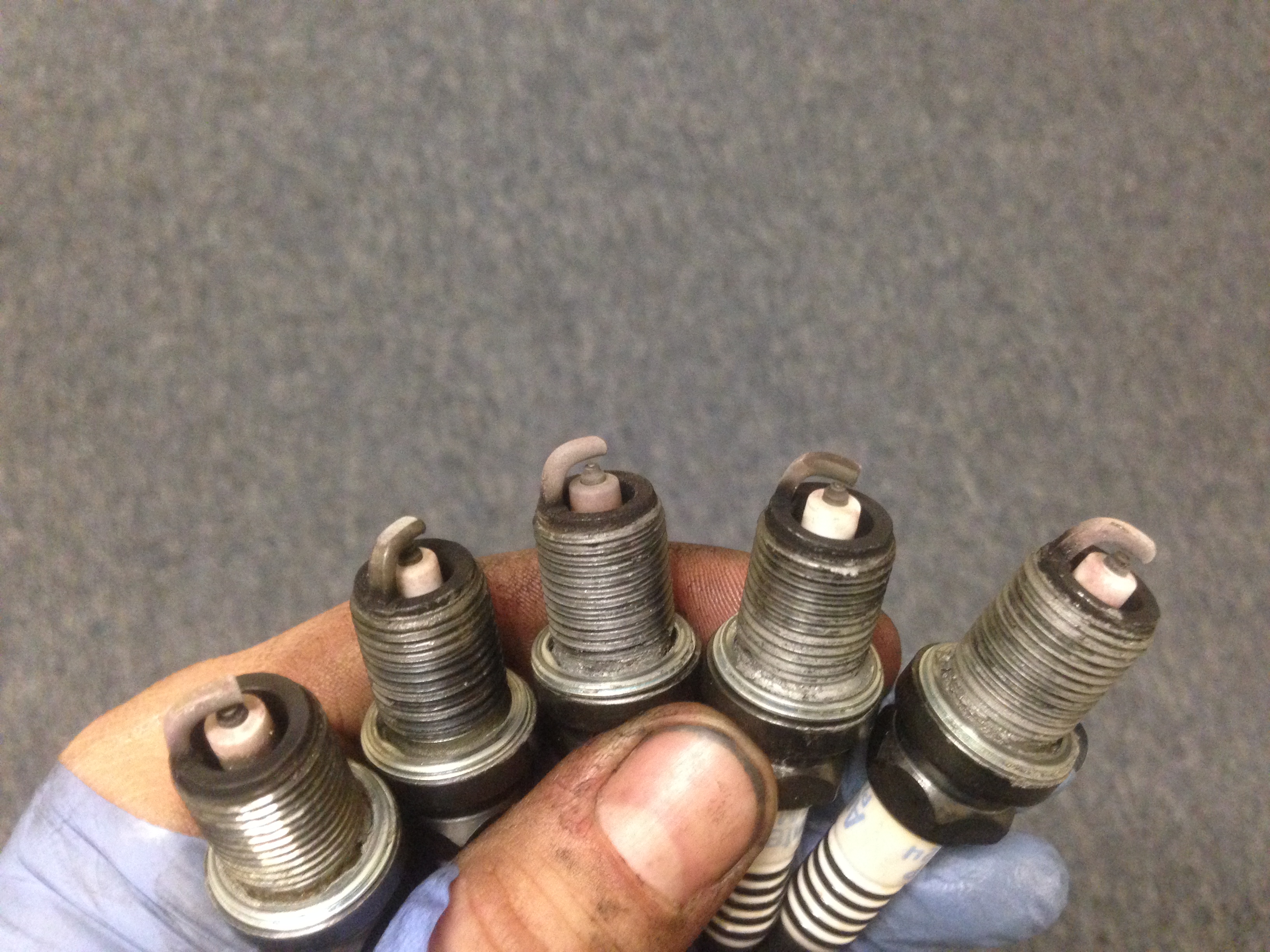 All right, I got my spark plugs out today (left to right 1-5). Compared to the pictures they seem ok. What are the pros thinking?