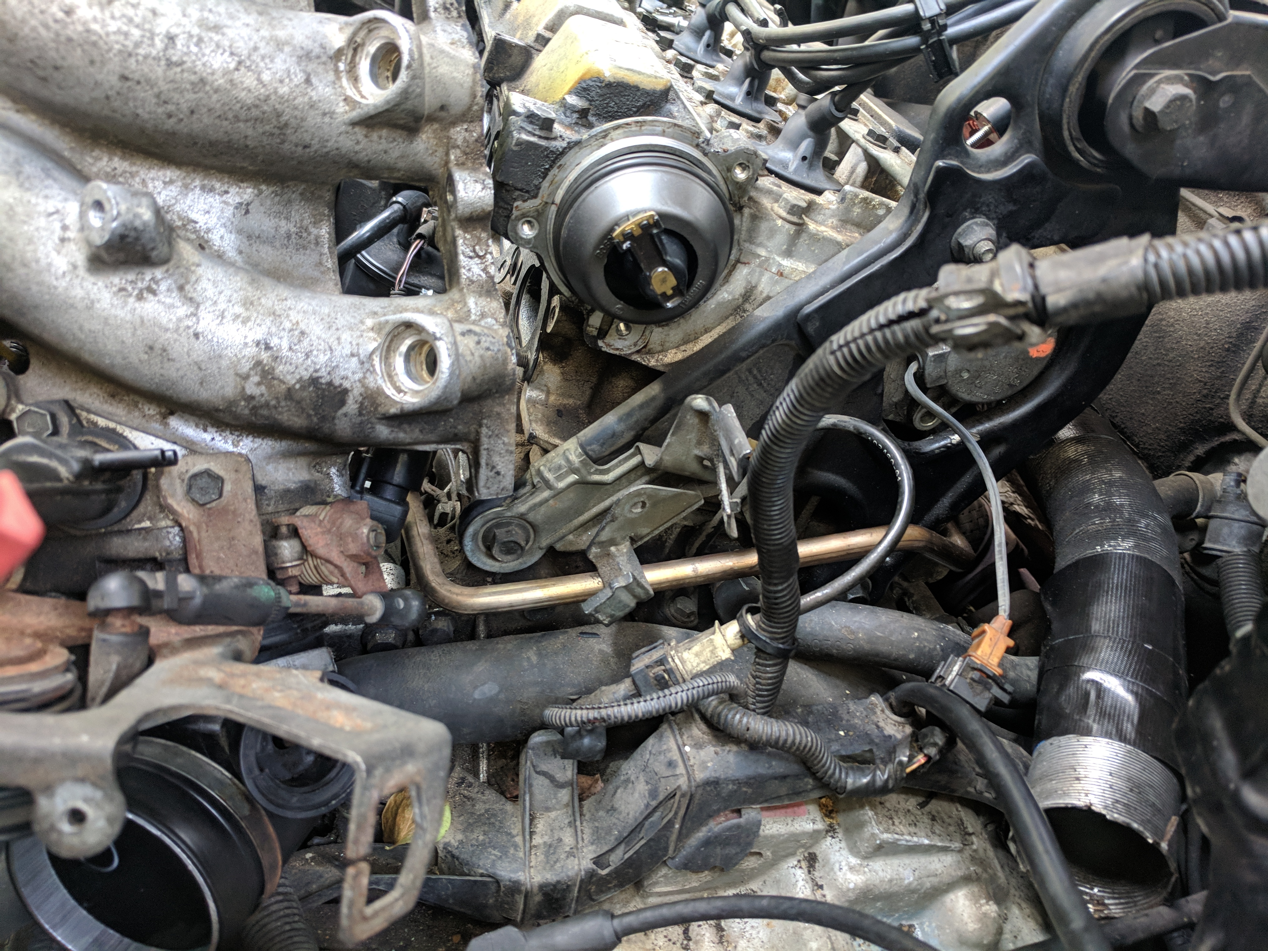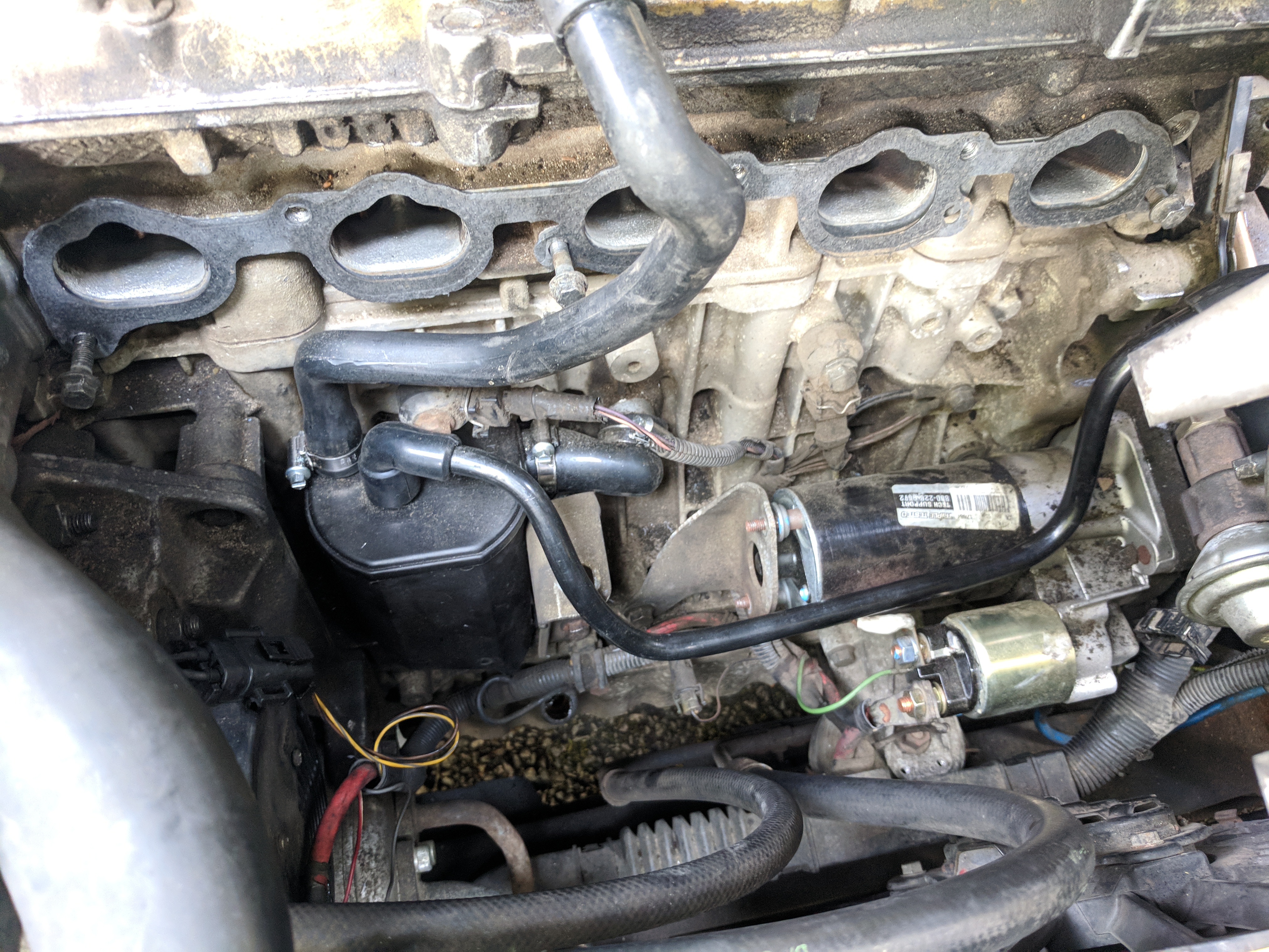 Also, when I was initially doing the PCV system, I noted that I didn't have a mounting bracket on the bottom right bolt. I'm assuming the previous owner removed it when they/their mechanic changed the PCV system.