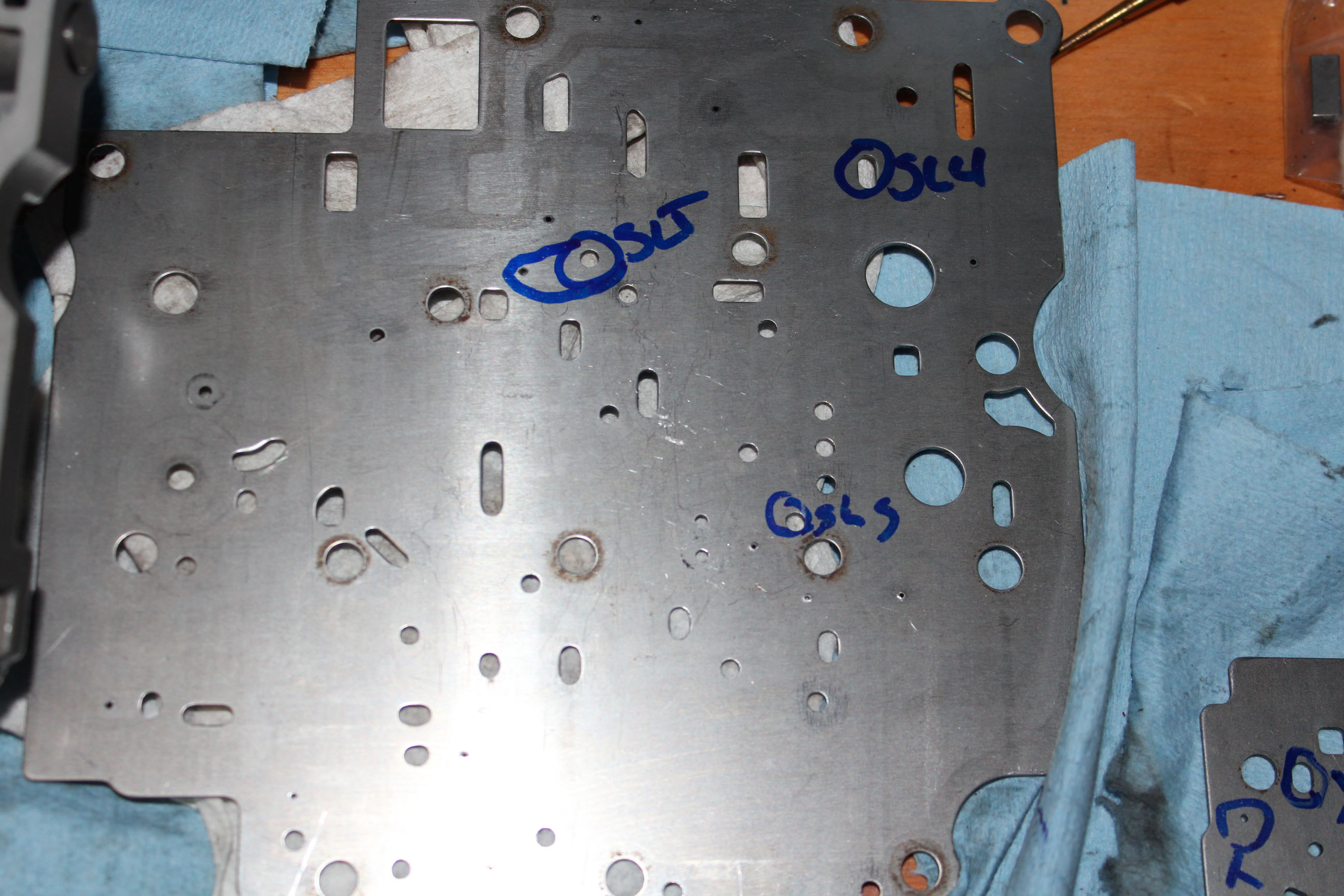 I attached a photo of the plate between the main body and front cover of the valve body, look for the smallest holes (not the ones circled) in the plate, these holes are the fluid pressure path to the solenoids and when the solenoids are closed fluid pressure builds to move the shift valves. One of the areas to check out.