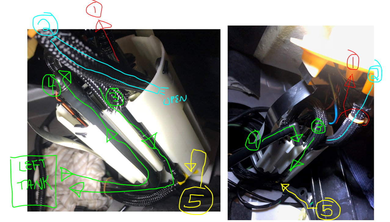 Ok, so finally got to it this morning (4:30-6am). No rats in the tank. Everything looks fine except for one thing. The return hose (4) from the left side tank looked to be out of position (not in it's channel). I inspected this before getting the pump all the way out so as not to have the pump removal disturb any root causes. Once I had the pump out (not fully as it seems to be enough to inspect without pulling the hose all the way out from the other side), I took MANY pictures, but I couldn't see any other obvious issues. Very small metal particles in the bottom of the tank, but only maybe 5-10 that I could see (left side).