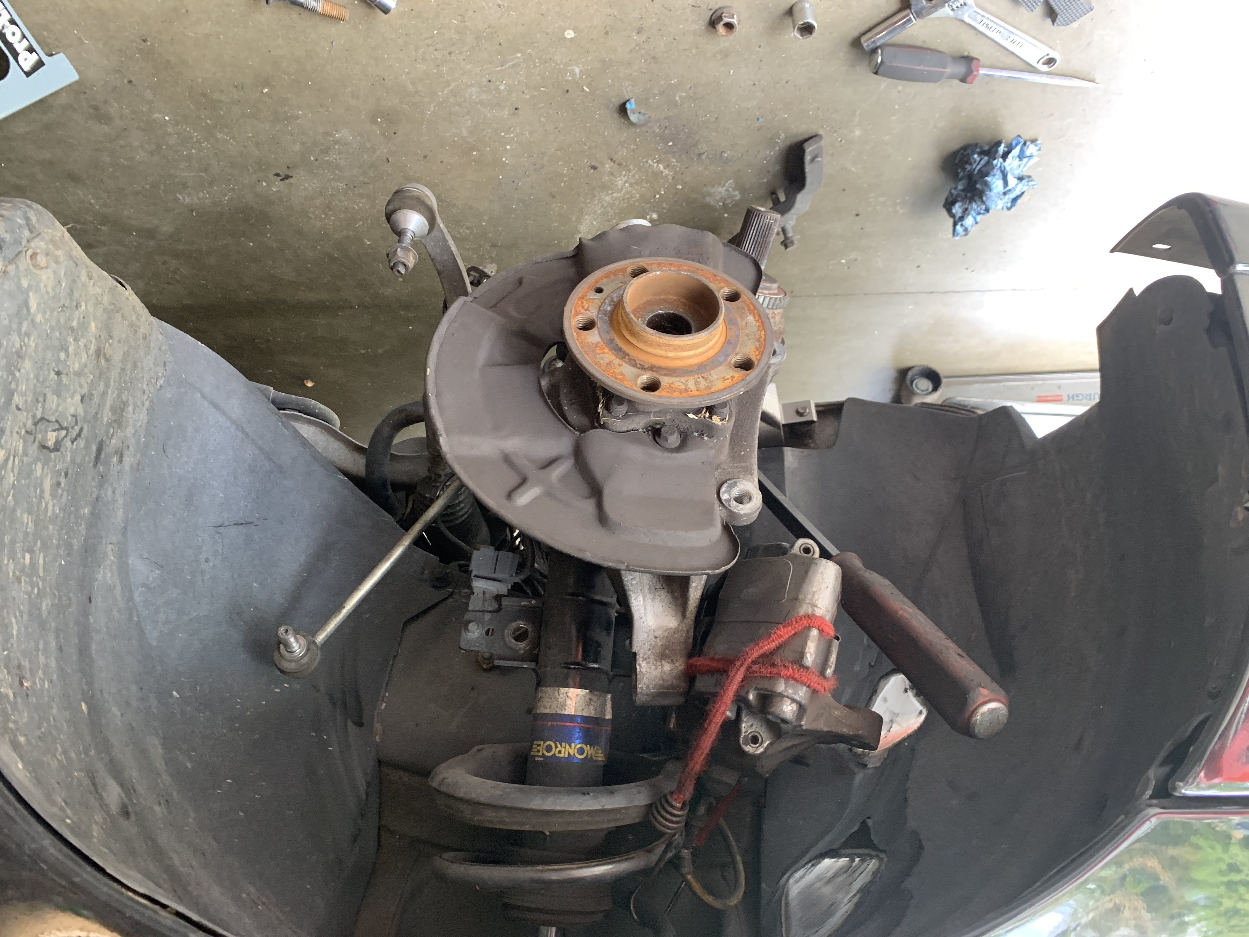 Changed the control arms on the S60R. Had an idiot moment and had the control arms on backwards... and I was wondering why I couldn't compress them enough to attach the spindles to the struts. I had too many distractions... they're marked for a reason!